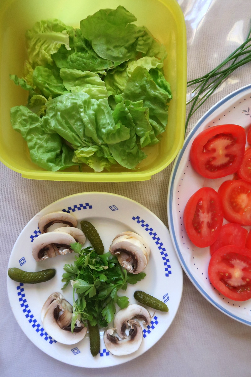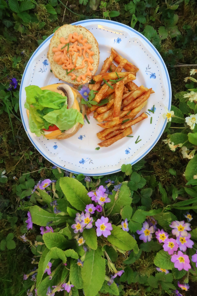 Nous avons utilisé des pains déjà prêts et tiédis au four, que nous avons garnis avec steaks hachés, champignons, salades, tomates (une tranche entière par personne et une autre partie revenue avec des oignons à la poêle), tranches de cheddar, cornichons et sauce à burger. Mes parents ne sont pas très burger (alors qu’ils ont adoré nos pizzas ah ah) mais Monsieur, Junior et moi nous sommes régalés.