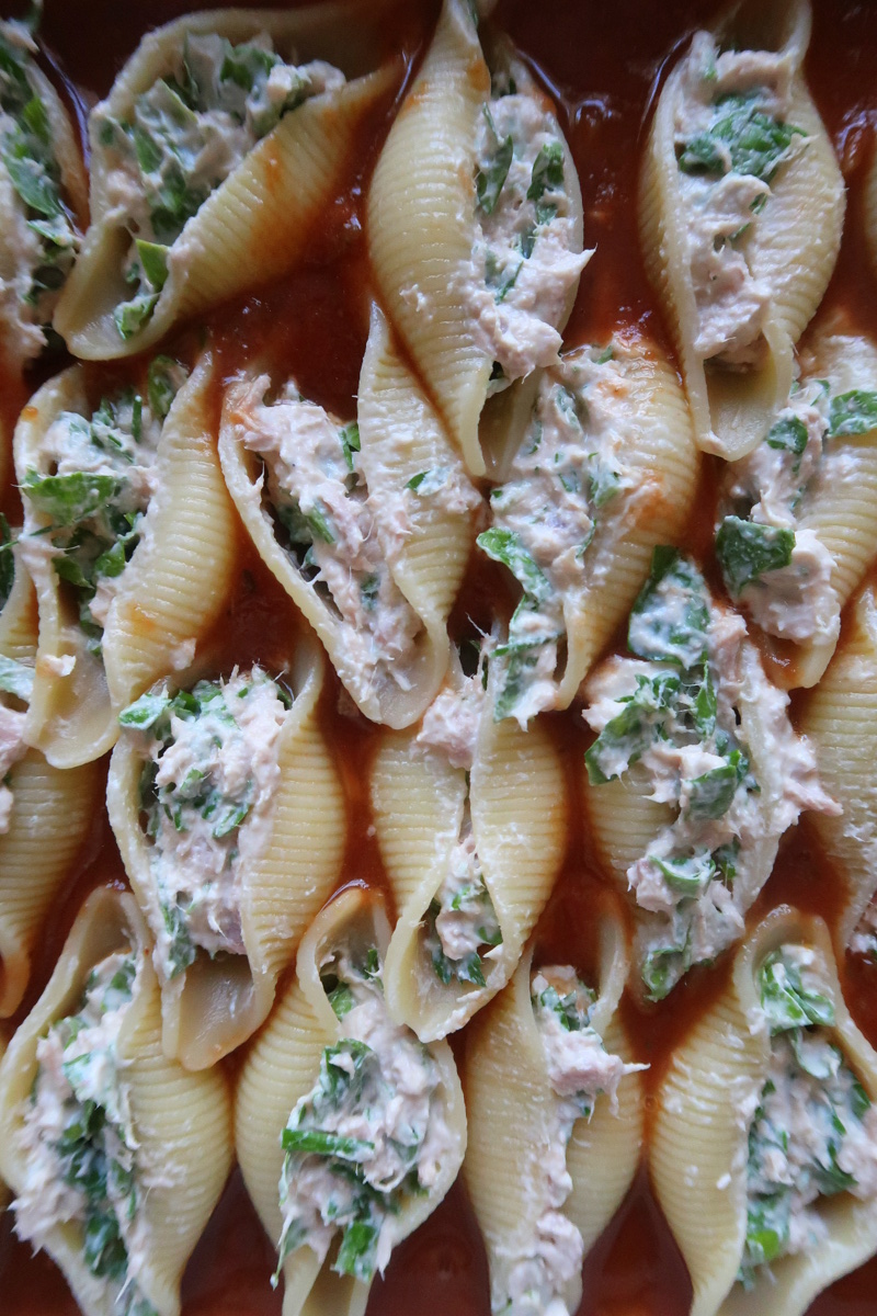 Conchiglioni thon, ricotta et épinards, sauce tomate et parmesan