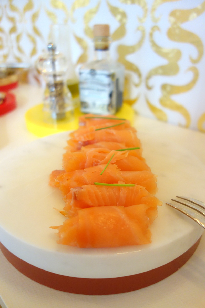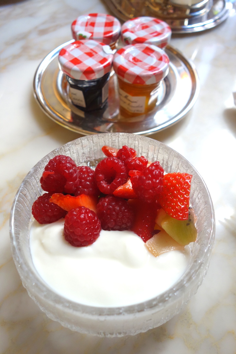 Le buffet proposait une salade de fruits délicats (avec des fraises et des framboises ♥), des viennoiseries, du fromage blanc, du pâté, du saucisson, du jambon, du saumon fumé, différentes sortes de fromage, des tomates cerises, etc. Les œufs peuvent être cuits à notre convenance. Du côté des boissons, j’ai dégusté un thé et un jus d’orange pressée.