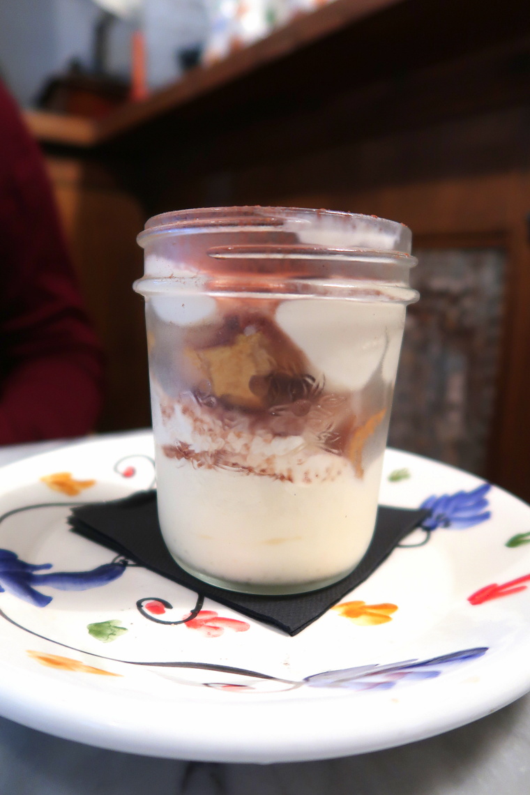 Monsieur a choisi de déguster un tiramisu au café (8€). Il l’a trouvé généreux et très doux. Amateur de ce dessert, il aurait bien trempé les biscuits un tout petit peu plus dans le café et/ou l’amaretto mais il n’a toutefois pas boudé son plaisir et a rendu le pot et la cuillère très propres. Quelques jours après, il se cuisinait un tiramisu pour en déguster de nouveau à l’appartement !