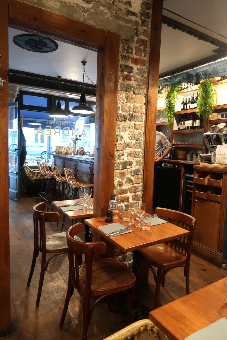 Nous avons retrouvé la déco qui nous avait déjà bien plu chez Andrea : comptoir, étagères bien remplies de produits gourmets, affiches colorées, etc. Le tout est un mélange de tradition et de modernité. Pendant le repas, le fond musical est sympa et enjoué : musique de Dirty dancing, etc. Nous sommes arrivés à l’ouverture mais le restaurant s’est bien rempli pendant le temps du brunch.