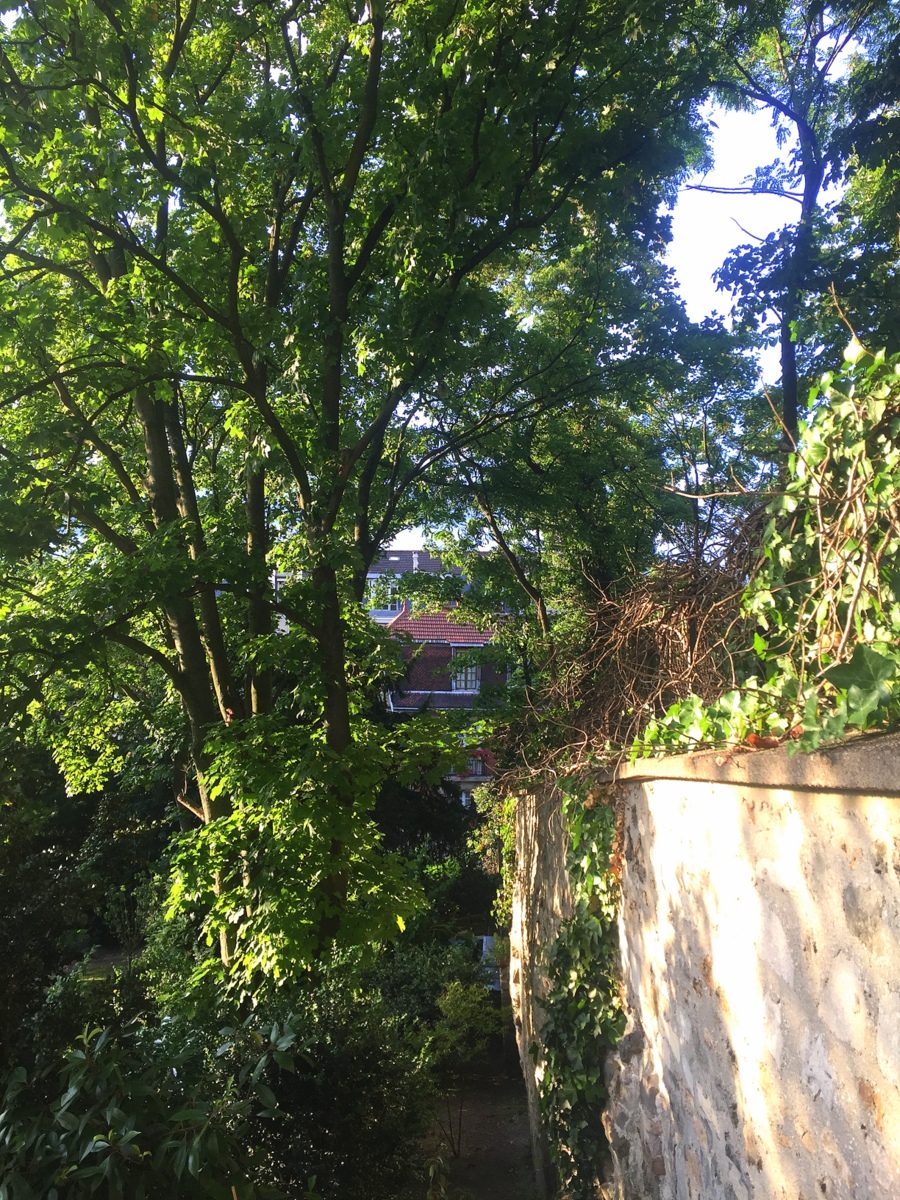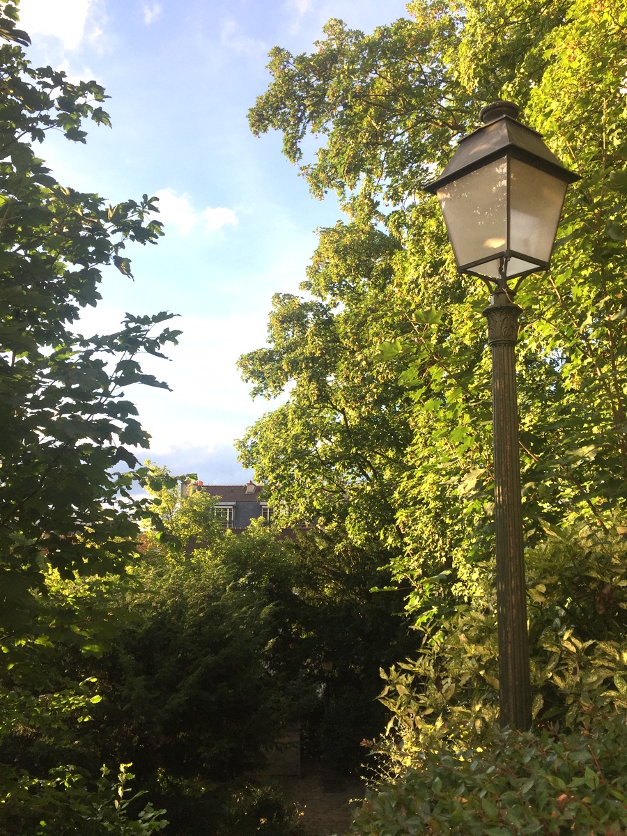 « À deux pas de la place du Tertre, les trois jardins Renoir entourent le musée de Montmartre et dominent les vignes. Ils ont été nommés en souvenir d’Auguste Renoir, le peintre impressionniste qui vécut sur place entre 1875 et 1877 et y peignit plusieurs chefs-d’œuvre, comme le Bal du moulin de la Galette, La Balançoire ou le Jardin de la rue Cortot. Les Jardins Renoir offrent une vue exceptionnelle sur les vignes du Clos Montmartre et, au-delà, la vaste plaine au nord de Paris. » Tout est dit ! La lumière du soir magnifiait le point de vue.