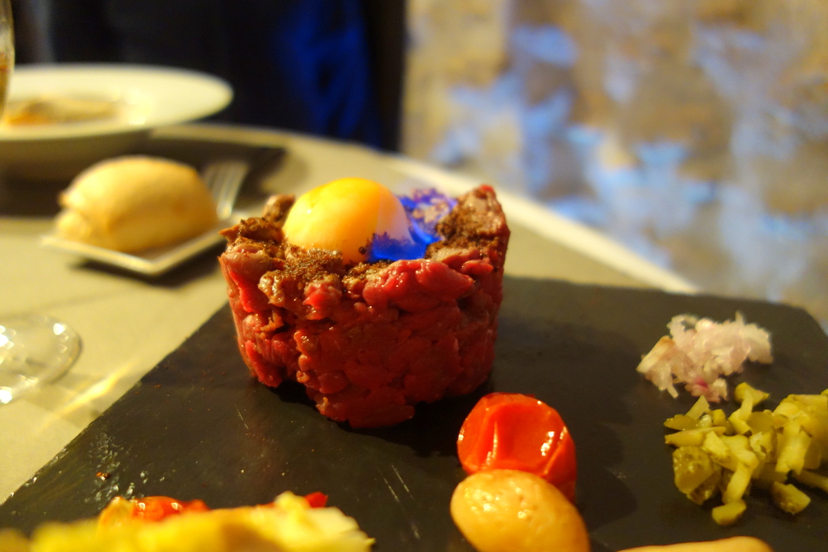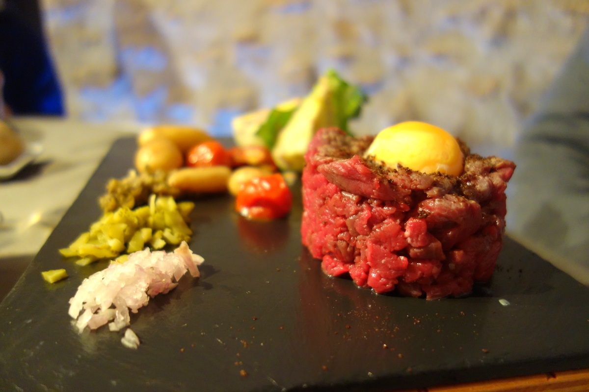 Monsieur a choisi le taureau en tartare flambé au thym pommes grenailles. Il a aimé goûter une viande originale et voir le tartare flamber. Malheureusement, il a déjà été plusieurs fois malade par le passé avec des tartares et, une fois encore, ça n’a pas manqué. Il a passé 24 (très) mauvaises heures pendant le week-end. Le message est passé : le tartare n’est pas un plat pour lui !