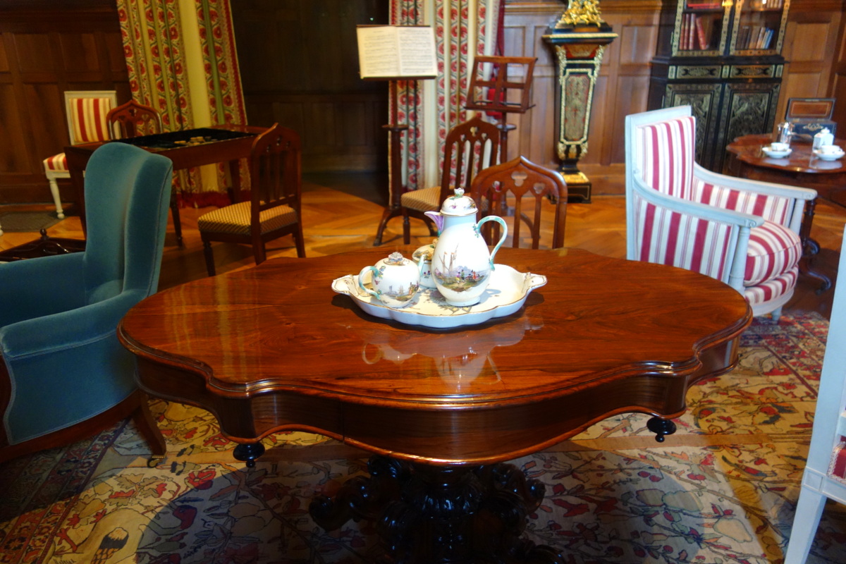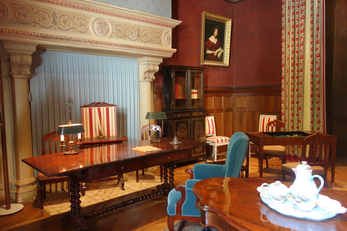 Vous le comprendrez, la salle qui m’a le plus marquée à Azay-le-Rideau est le grand salon, situé au rez-de-chaussée. Restitué en février 2016, il offre au regard des visiteurs son aménagement du XIXe siècle. La grande cheminée date de 1856. La toile peinte qui imite les cuirs de la Renaissance, les fauteuils, les chaises néo-gothiques, la table de jeux, etc. : de tout émane une grande impression de luxe et de confort. Comment ne pas s’imaginer s’y installer avec un bon livre ou un peu de compagnie ?