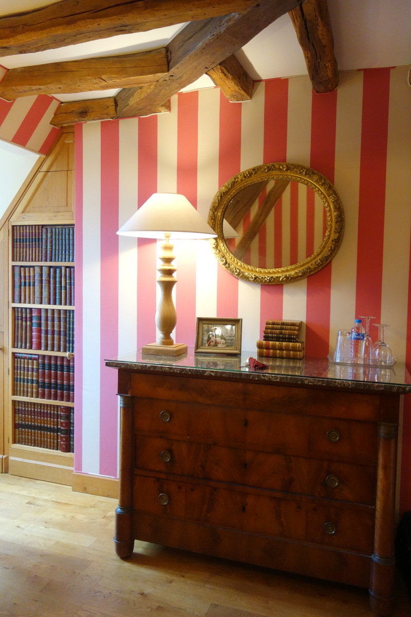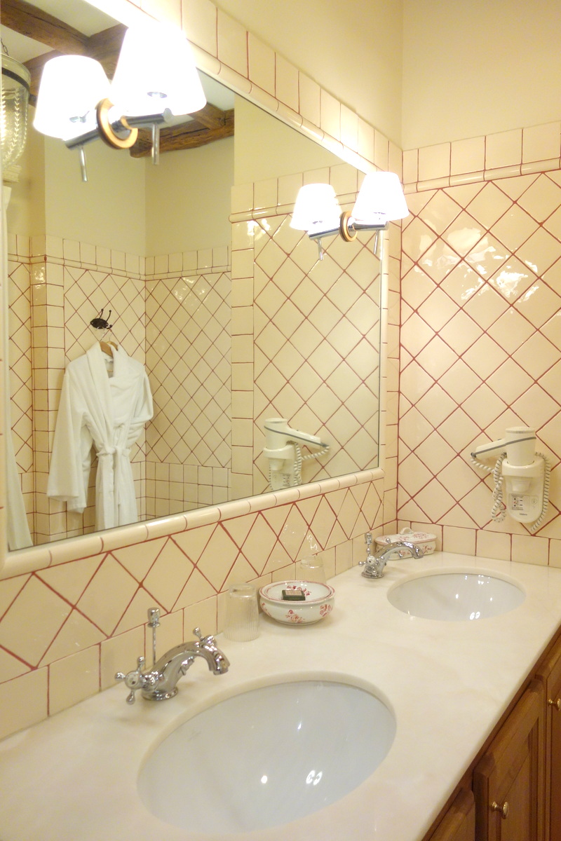 Nous avions la chambre Vogüé, située au deuxième étage, sous les toits. Comme ses voisines, elle est climatisée, ce que nous avons beaucoup apprécié en ce mois de juin (mon petit doigt me dit que les hôtes de cet été caniculaire apprécient également) ! La pièce est joliment tapissée de rose et de blanc et accueille un grand lit de 180 cms de large. Cheminée, poutres et mobilier ancien donnent un très beau cachet à l’ensemble. L’ensemble reste toutefois plutôt actuel et on ne dort clairement pas dans un musée.