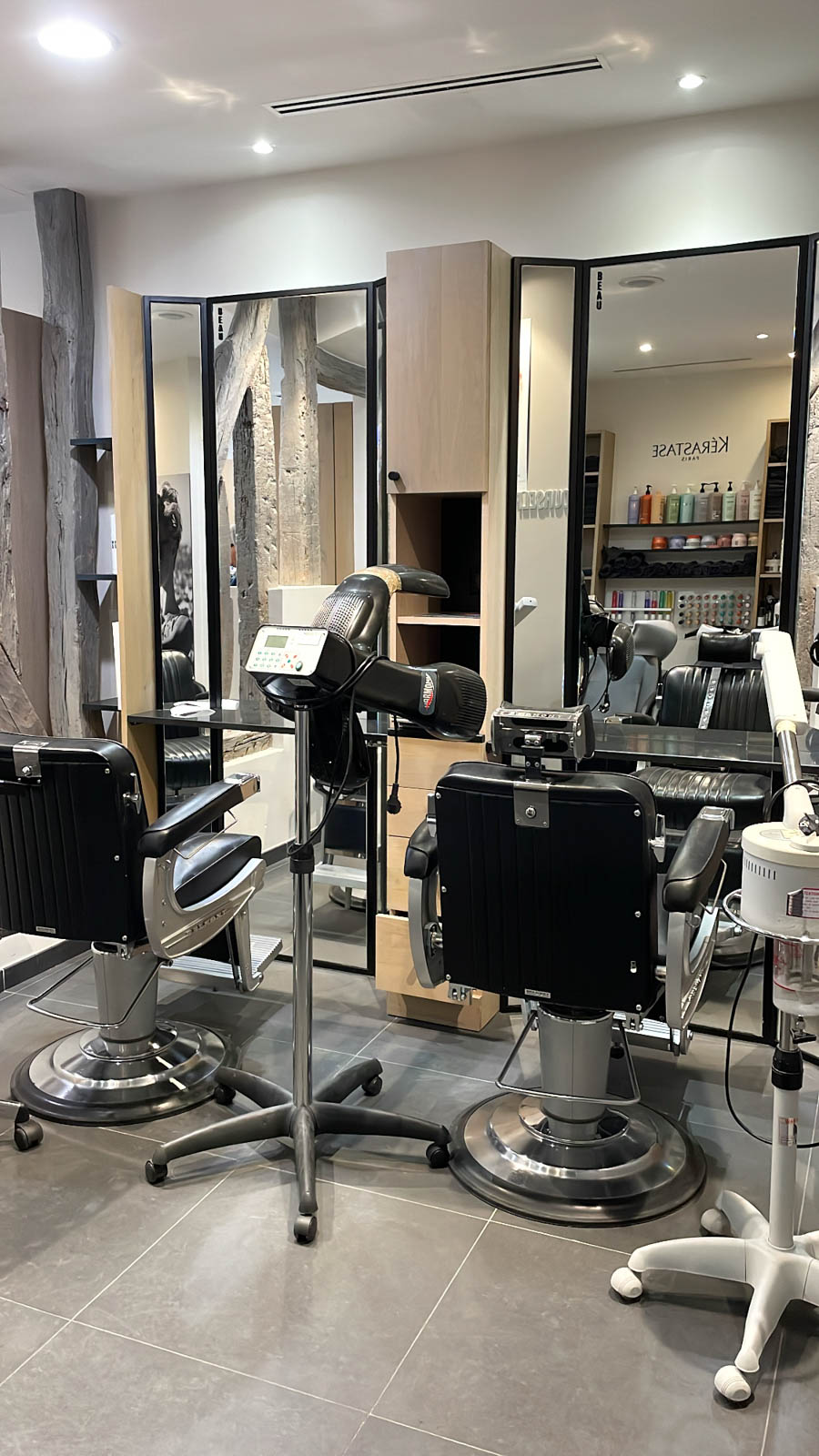 Le salon de coiffure dispose d’un bel espace avec plusieurs postes de coiffure. La décoration est élégante dans des tons blancs, noirs et boisés. Je m’y suis rendue des matins en semaine et l’ambiance était agréable et calme.