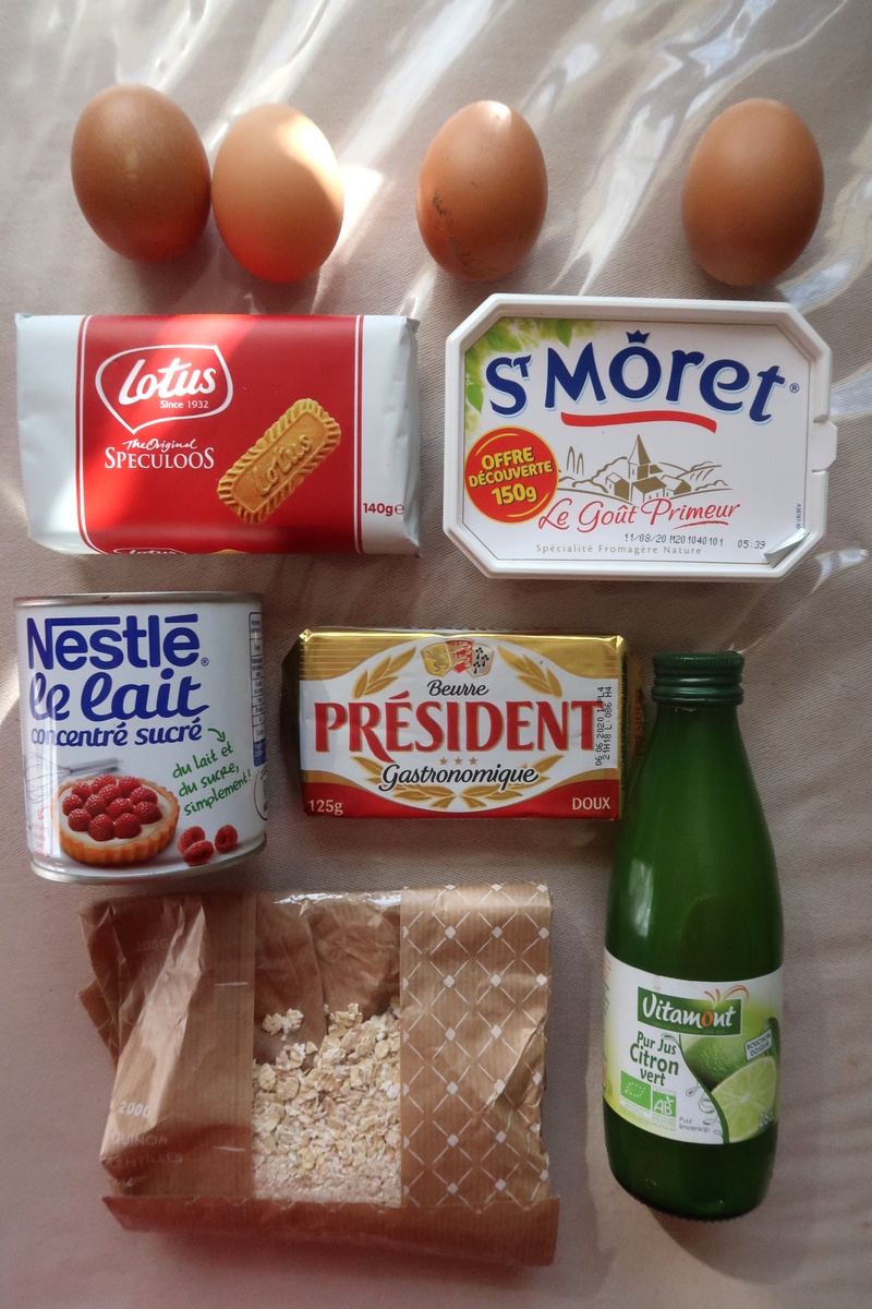 Nous avons réalisé la recette de Key lime pie de Paris with Charlotte. Pour la réaliser, elle conseille d’utiliser un moule à charnière de 20-22 cms. Je vous écris ici la recette en vous indiquant ce que nous avons légèrement modifié.