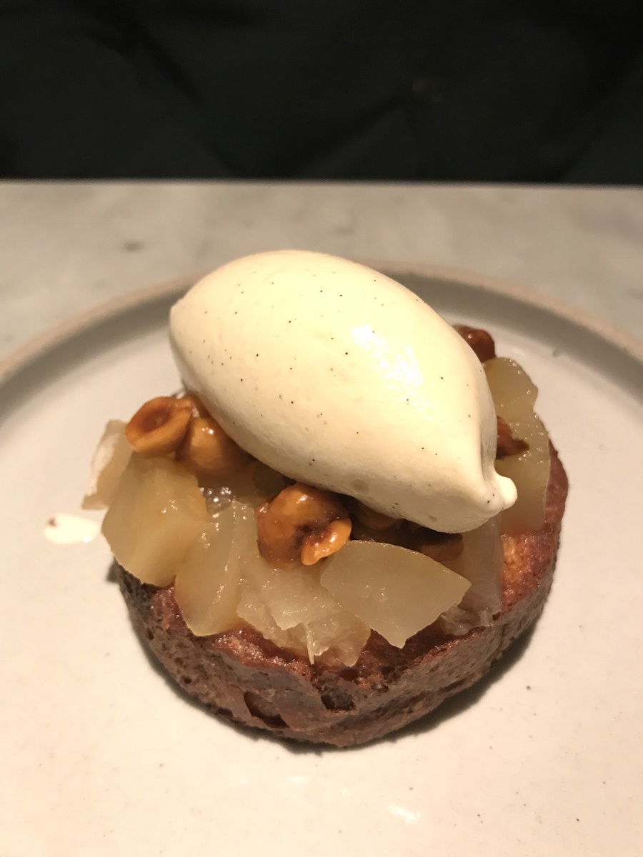 Monsieur a dégusté un pain perdu aux poires, caramel de noisettes, glace vanille (12€). C’était un dessert gourmand et raffiné qui se cachait malicieusement derrière un intitulé de dessert aux accents, historiquement, populaires. Monsieur indique que ce dessert saura vous combler et vous régalera à sa juste valeur d’autant plus si avez su rester, en amont, raisonnables !