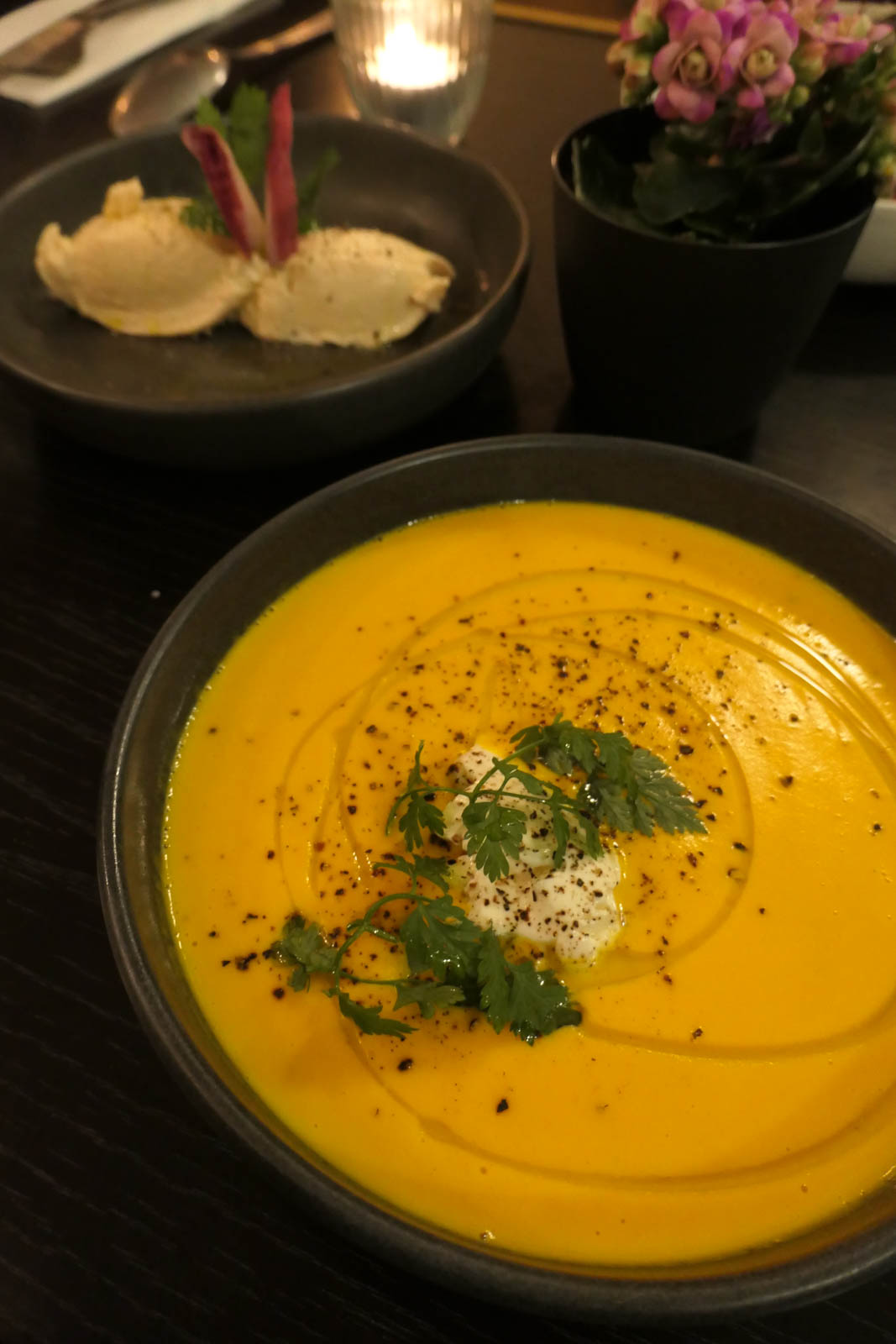 En entrée, bien que tentée par la poêlée de champignons aux herbes, œuf confit, j’ai choisi de déguster un velouté de potimarrons (8€), bien onctueux, vraiment délicieux.