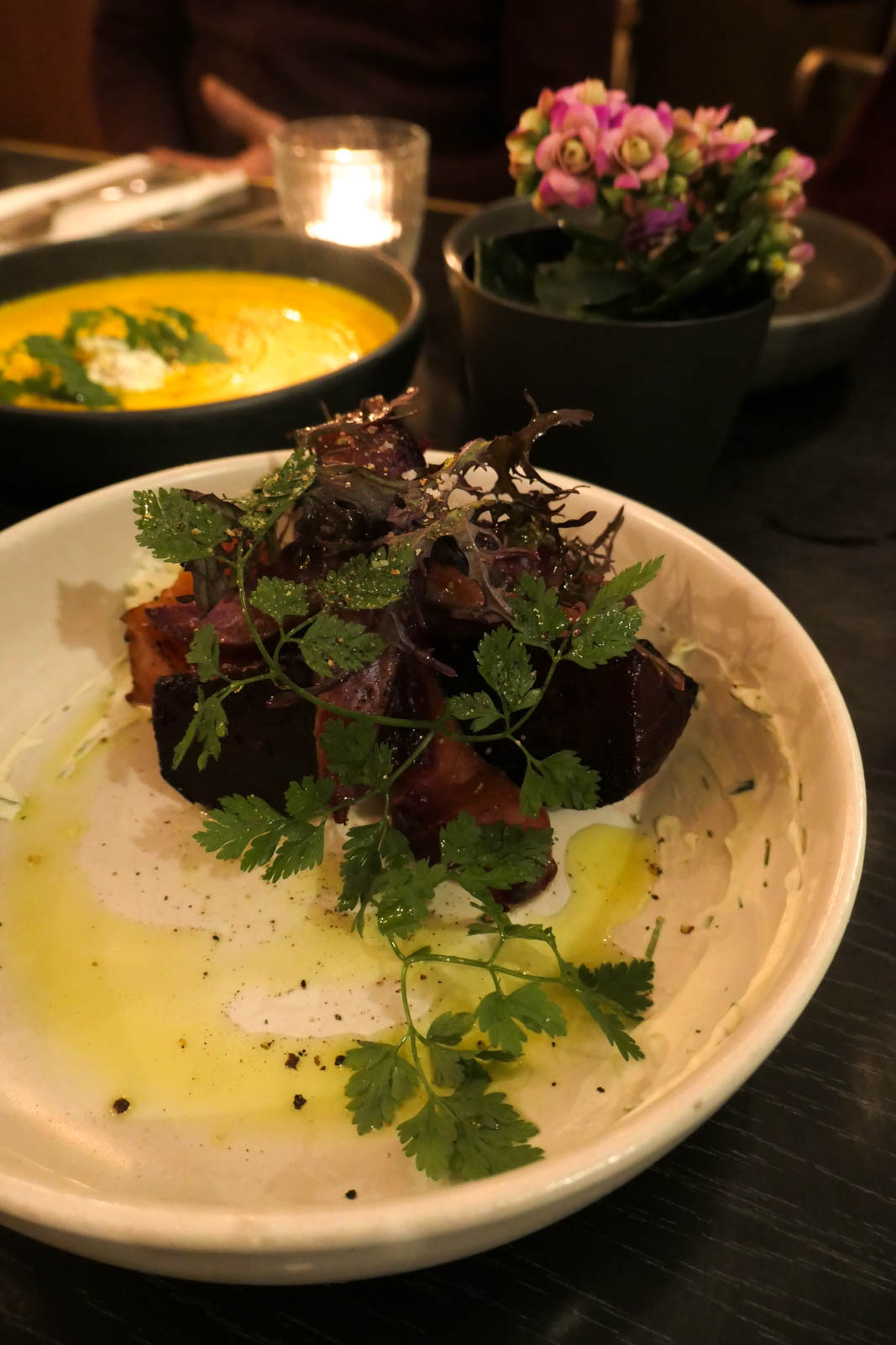 Juste après les fêtes, j’ai choisi un plat à base de légumes – très gourmand en réalité – mais aurais tout-à-fait pu choisir le risotto à la truffe. C’est donc l’assiette de légumes rôtis, purée de carotte au cumin, œuf mollet (19 €) que j’ai commandée. J’ai aimé que le contenu de l’assiette soit coloré et que les légumes soient variés, avec des textures différentes. L’œuf mollet est une valeur sûre. Un plat très généreux !