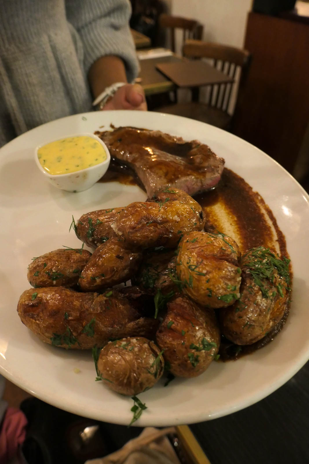 Monsieur a dégusté un cœur de rumsteck argentin et friture de grenailles baby (20 €). La viande était savoureuse, très tendre et la cuisson souhaitée a été respectée. La sauce béarnaise est particulièrement réussie, tout-à-fait délicate, et la virgule de jus de cuisson très parfumée. Une généreuse portion de pommes de terre grenailles à la fleur de sel est servie avec la viande.