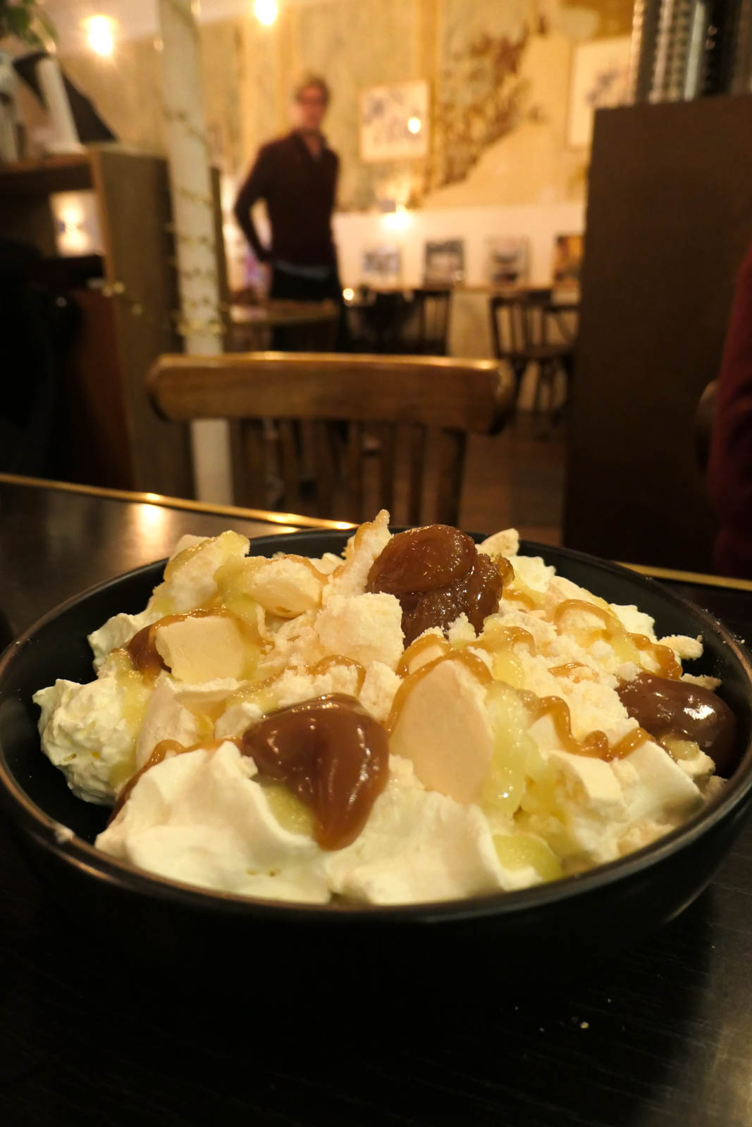 - Vue en salle : la pavlova aux marrons et marrons confits, meringue maison