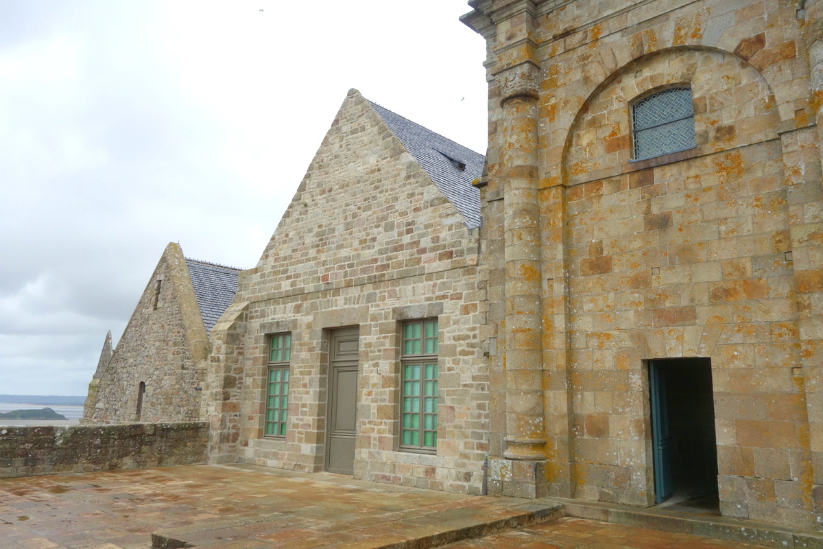 La terrasse de l’Ouest est un lieu idéal pour s’émerveiller devant la baie. Elle permet aussi d’observer un peu de l’architecture de l’abbaye. Au sol d’ailleurs, l’architecte a choisi de laisser des marques visibles : il s’agit d’indications pour quantifier le salaire des tailleurs de pierre qui ont travaillé à la construction de la terrasse !