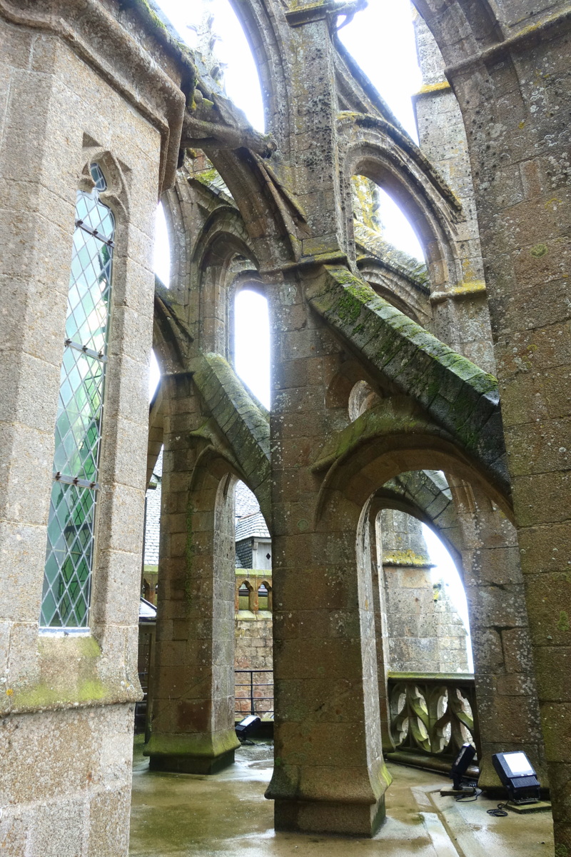 Le cloître de la Merveille de l’abbaye du Mont-Saint-Michel, qui doit dater de 1228 si je ne dis pas de bêtise, est en restauration de janvier à novembre 2017. Les visiteurs peuvent passer par une partie de la galerie pendant les travaux. Ceux-ci portent notamment sur l’étanchéité et la remise à niveau du sol, en fonction des fouilles archéologiques qui ont été menées. Beaucoup de soin est apporté au chantier. La pierre est vivante et il faut notamment trouver des produits qui ont le moins d’éléments actifs possible pour éviter des effets secondaires.