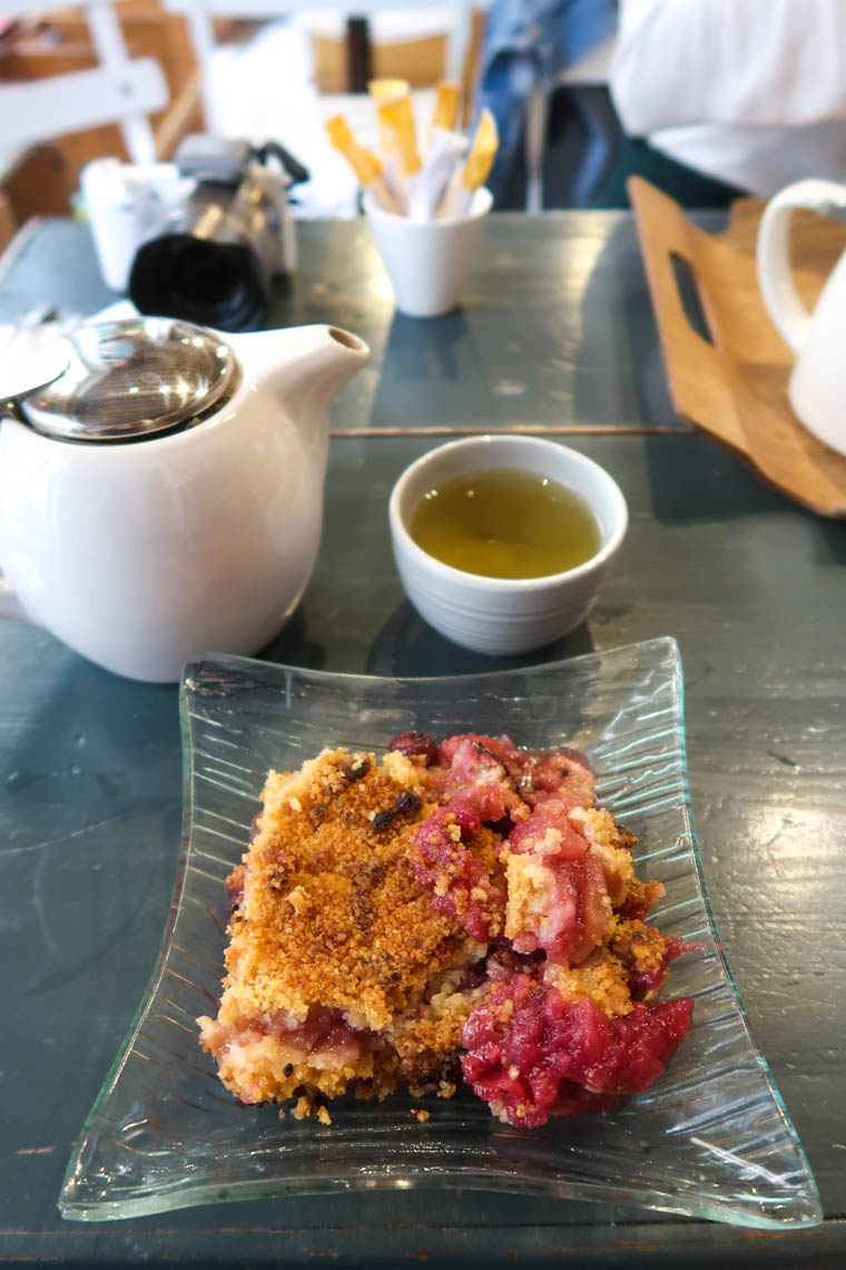 Quelques tables et chaises sont installées à l’étage de Mémoranda pour profiter d’une pause gourmande. J’ai dégusté une tisane bio Les Jardins de Gaïa (3,60€) en prenant conseil auprès de l’équipe. C’était un mélange de plantes au nom évocateur : Jardin enchanté. Et, très friande de crumble, j’ai craqué pour celui de la maison (4,50€). Le choix de boissons et de douceurs était grand : cakes, etc.