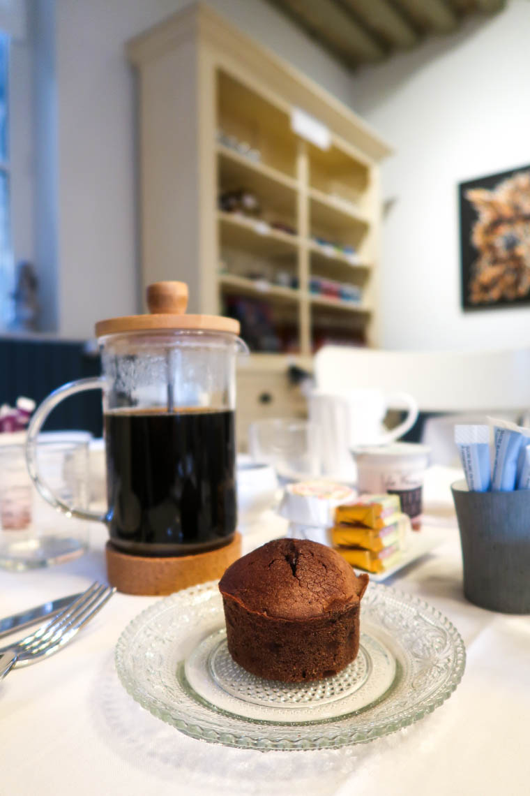Ayant déjà amplement profité des bonnes choses pendant le séjour, il n’était évidemment pas possible de « tout » goûter : yaourts, etc. Mais un dessert individuel nous attendait à table chaque matin : un fondant au chocolat de folie le premier matin et une part de tarte aux pommes le second. J’ai aussi dégusté un pain au chocolat, vraiment excellent, de la bonne baguette, etc.