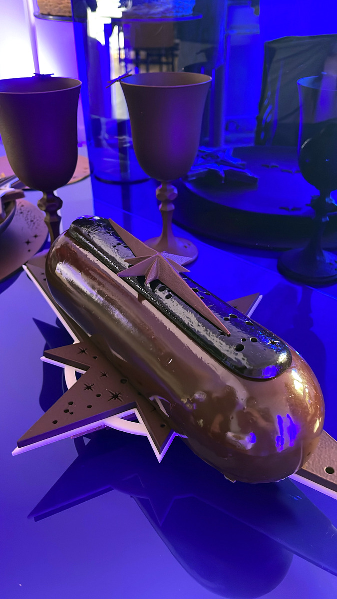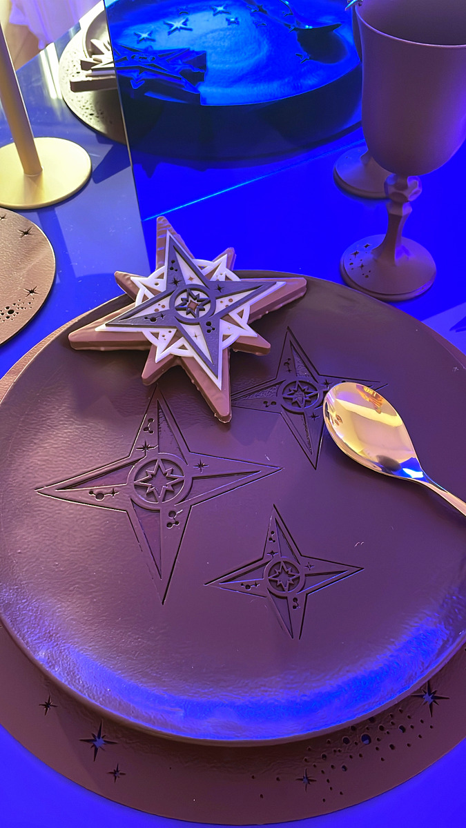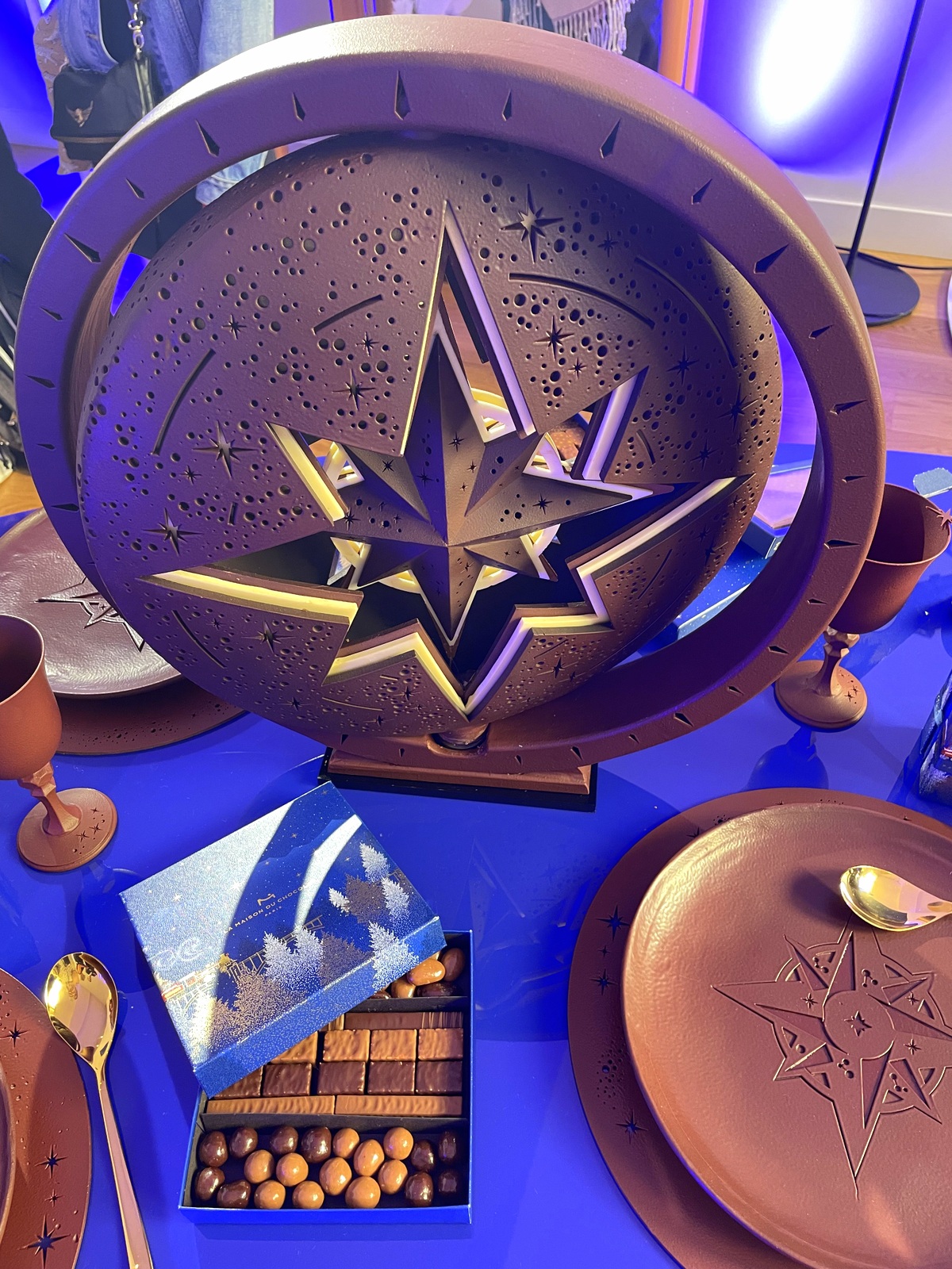 Noël dans le vent est la pièce artistique 2024 (3 200 €) signée Nicolas Cloiseau et éditée en une dizaine d’exemplaires. D’un diamètre de 50 cm, elle est entièrement réalisée à la main et nécessite une semaine de travail. Il s’agit d’une rose des vents facettée en suspension au cœur d’un disque circulaire en chocolat finement ouvragé pivotant dans un arceau de chocolat. Le tout est ajouré de 2550 perforations et décoré de 80 étoiles réparties sur les 5,4 kg de chocolat, noir pure origine Bali 68%, lait 37% et ivoire 33%, qui composent la création.