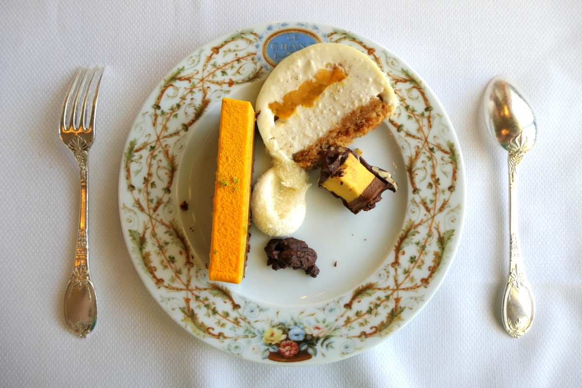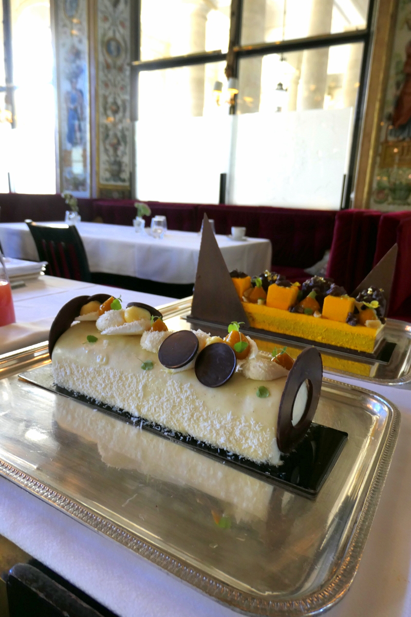 • la bûche du Grand Véfour : Mangue & Coco (88€), élaborée à partir de chocolat noir intense, de fruits exotiques et en particulier de la mangue travaillée sous diverses formes, mais aussi de fruits de la passion, de citron vert et de gousses de vanille. Très réussie, cette magnifique bûche allie des formes rondes et des cubes de tailles variées.