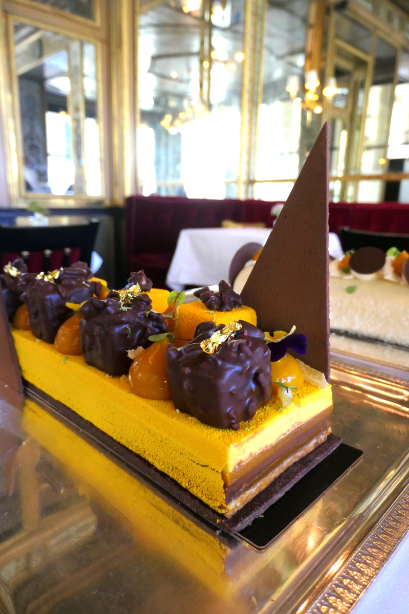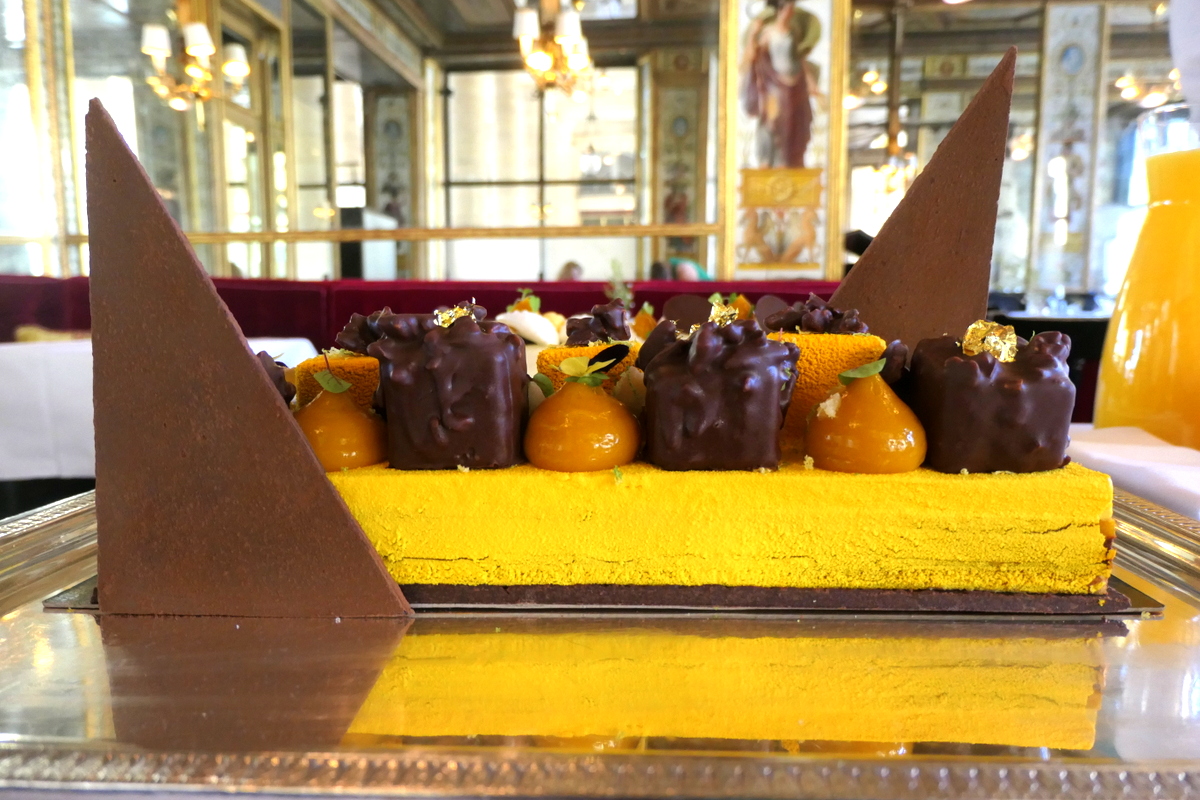 - la bûche du Grand Véfour : Mangue & Coco (88€), élaborée à partir de chocolat noir intense, de fruits exotiques et en particulier de la mangue travaillée sous diverses formes, mais aussi de fruits de la passion, de citron vert et de gousses de vanille. Très réussie, cette magnifique bûche allie des formes rondes et des cubes de tailles variées.