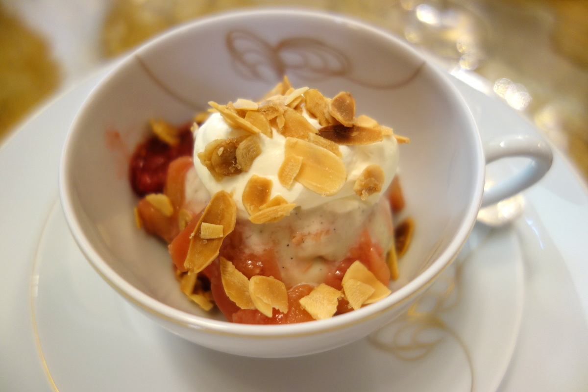 Puis vient la pêche Melba, inventée au Ritz par Auguste Escoffier pour la cantatrice Nellie Melba qui souhaitait finir ses repas sur un dessert léger. Chacun peut s’amuser à reconstituer sa pêche Melba à partir des ingrédients apportés avec la glace.