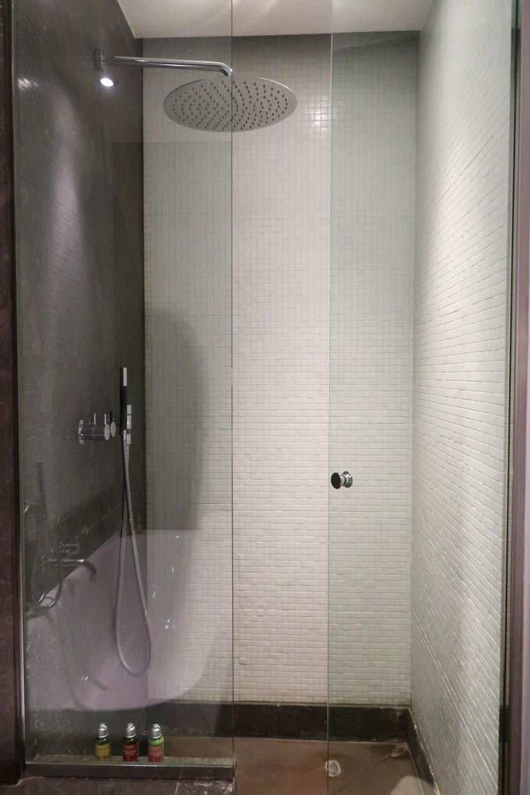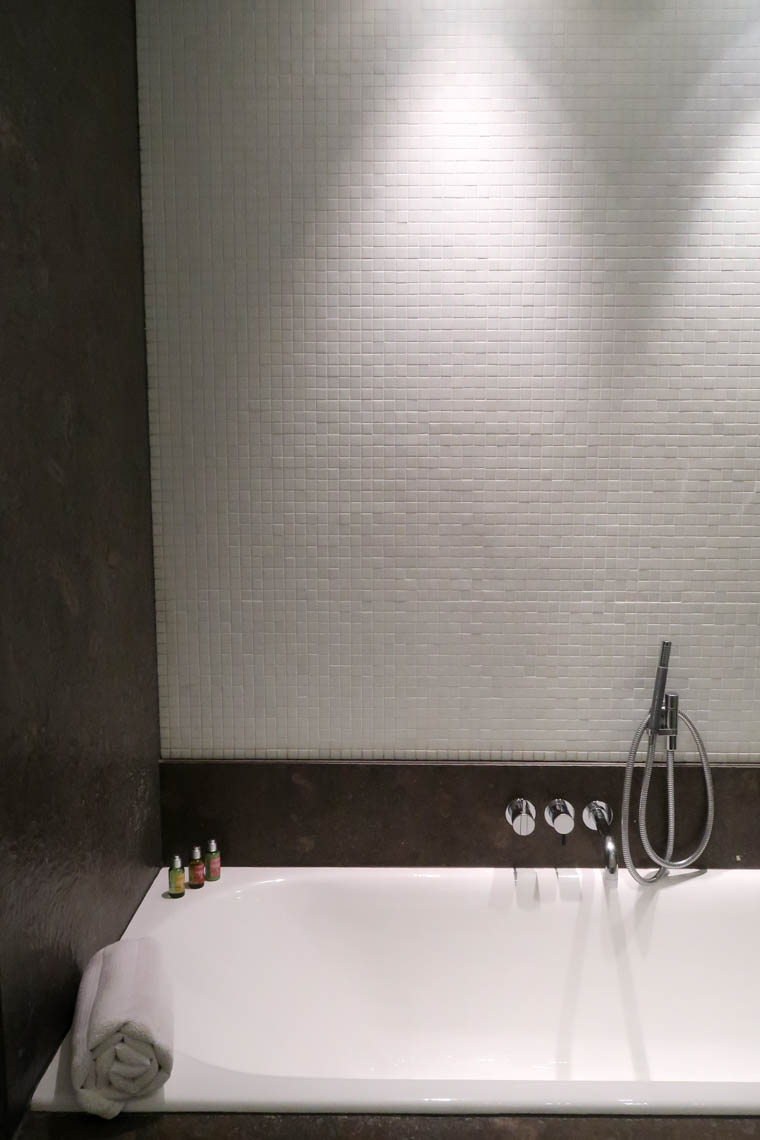 La salle de bains combine une grande baignoire et une vaste douche. J’avoue que nous nous sommes surtout servis du rebord de la baignoire pour poser nos affaires et avons pris des douches (à quand le mode d’emploi de la robinetterie ?). Les produits de toilette mis à disposition sont des produits L’Occitane, une marque que j’apprécie trouver dans les hôtels.