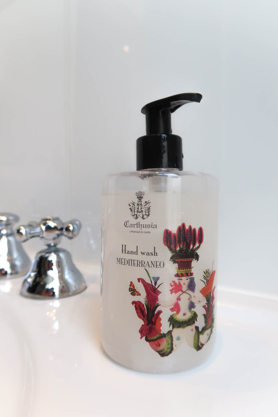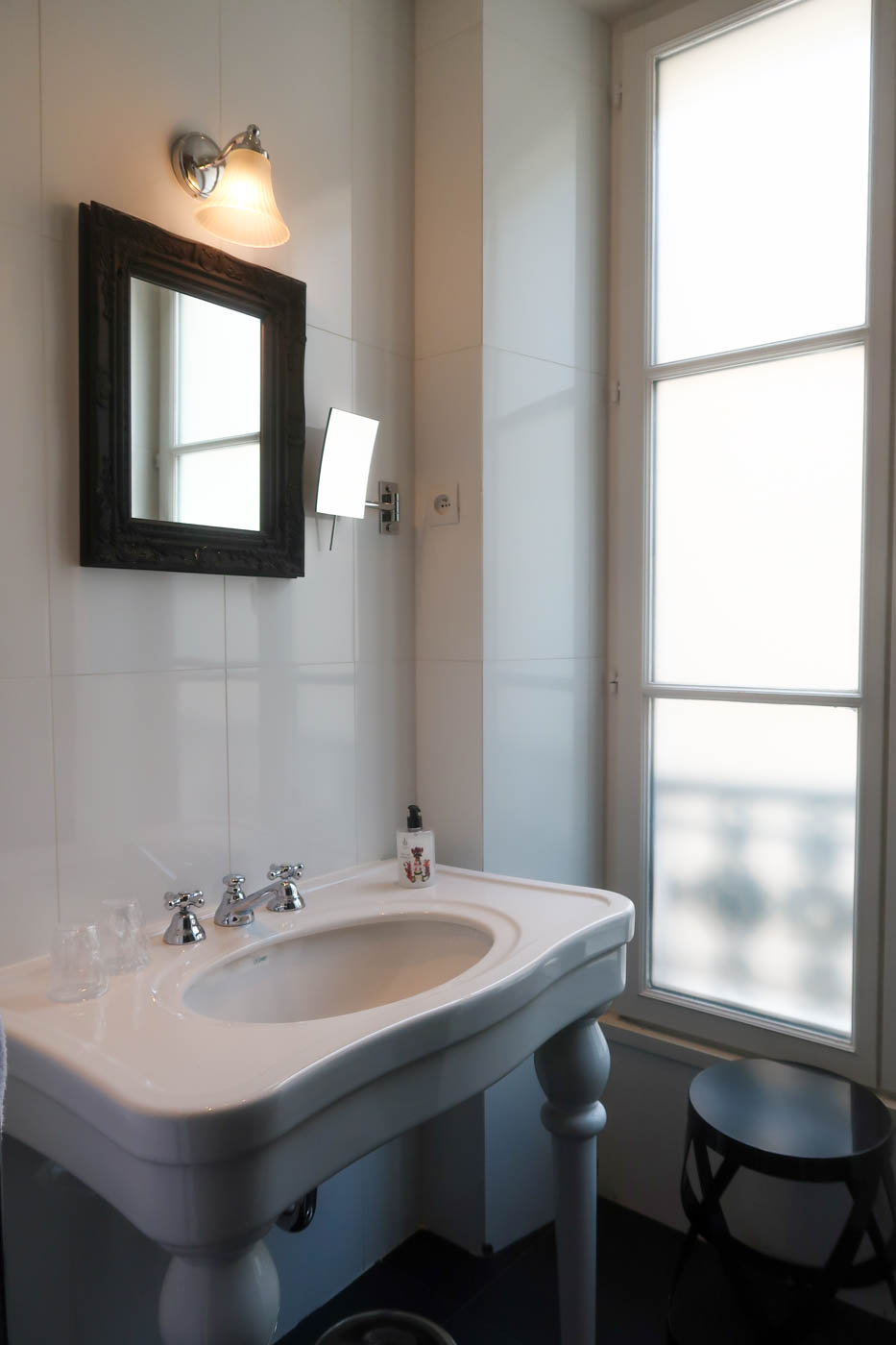La salle d’eau est lumineuse, propre et fonctionnelle. Elle dispose d’une grande fenêtre. Si l’espace n’est pas très grand, il est bien agencé. On retrouve l’esprit XIXe dans la décoration même si la douche est, quant à elle, bien moderne avec une robinetterie à l’effet vintage. Pour une fois à l’hôtel, pas de confusion possible pour la sortie d’eau au moment de se laver : on ne peut pas se tromper entre le pommeau de douche et la douche fixée au plafond. De-même, la température d’eau est constante. On se sèche avec une serviette tiédie par le chauffe-serviettes. Des produits Carthusia sont mis à disposition. Les toilettes sont séparées.