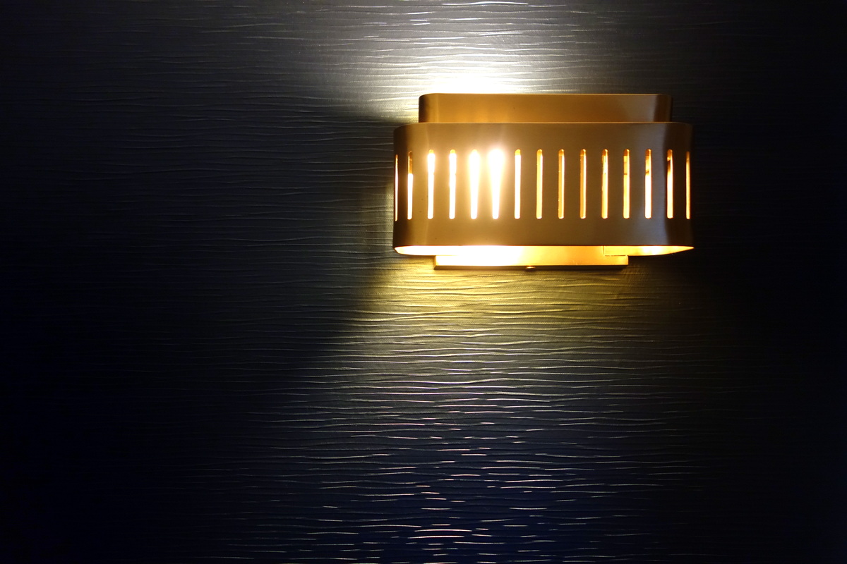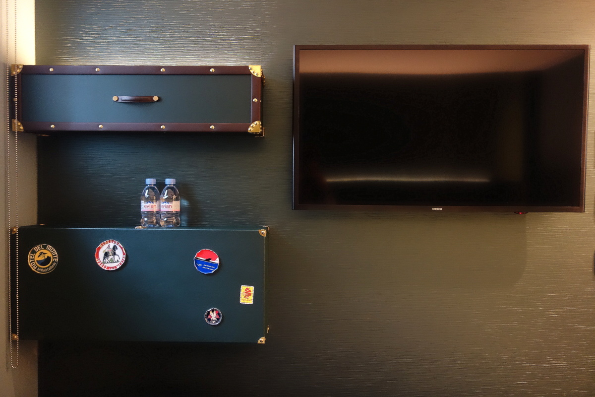Un astucieux petit bureau se cache dans une malle fixée au mur. À son ouverture, une lampe vient éclairer l’écritoire. L’armoire renferme un coffre fort et un petit plateau de courtoisie qui comporte une bouilloire, deux tasses, du thé et du café. Elle s’éclaire lorsqu’on l’ouvre. La chambre ne compte pas de place perdue : tout est vraiment optimisé et fonctionnel. Les personnes connectées que nous sommes tous désormais ne manquent pas de prises, y compris USB, pour leurs appareils. Le wifi est gratuit.