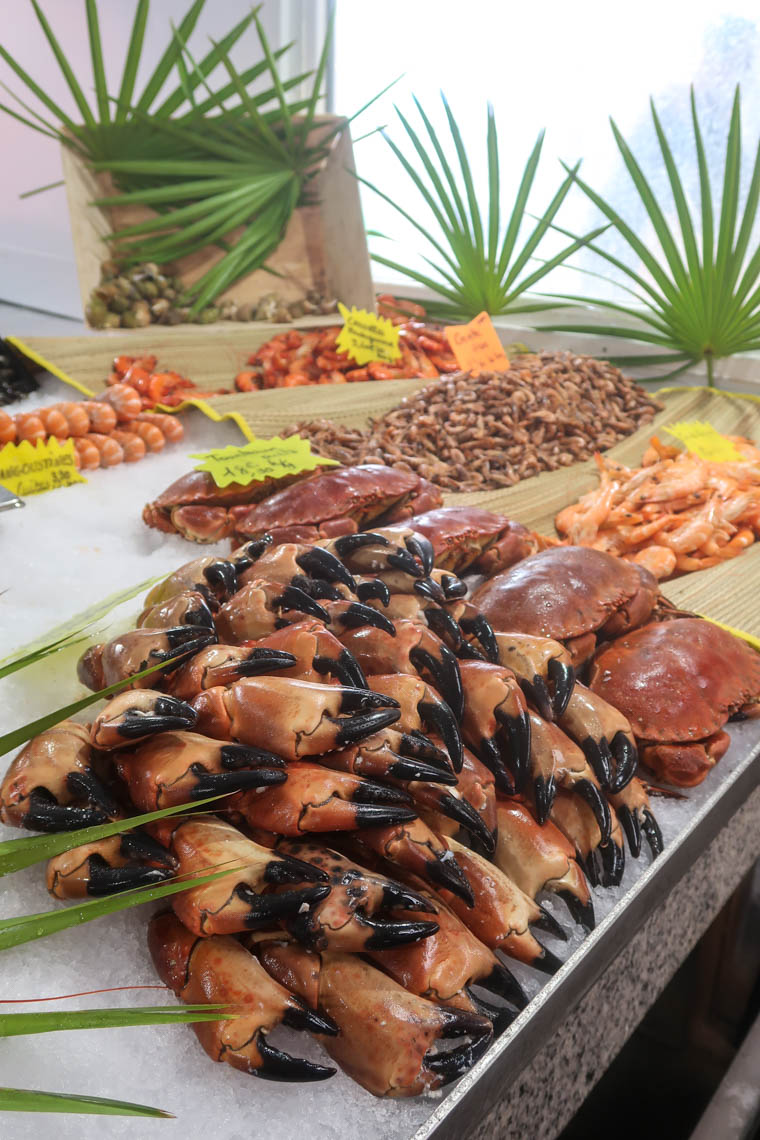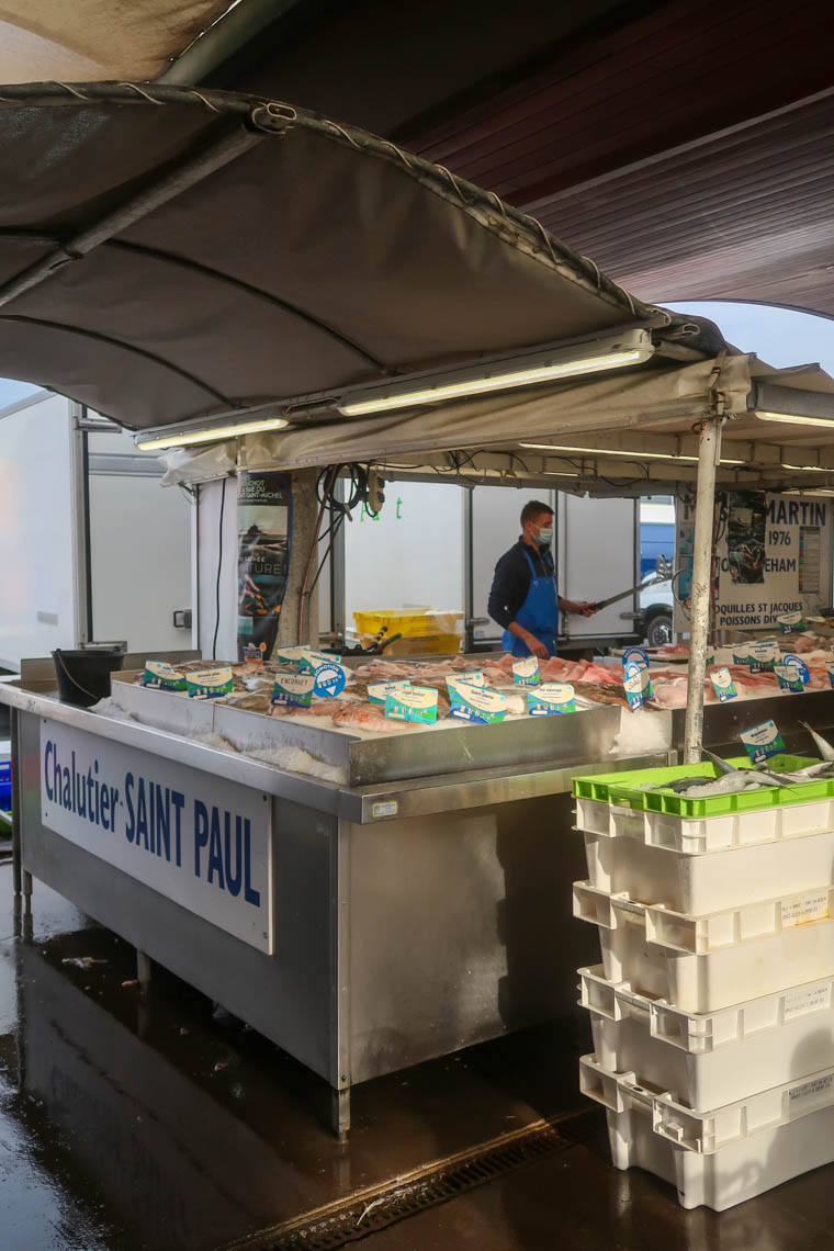 La journée a commencé au port de Ouistreham, depuis lequel nous avons vu œuvrer les marins de retour de la pêche. À quelques mètres des chalutiers se trouve le marché aux poissons. De 8h à 13h, toute l’année, pêcheurs et poissonniers y proposent la pêche fraîche de la nuit. Poissons, coquillages et crustacés n’attendent que nous ! Pour quelques prix pris au hasard : le kilo de barbue était ce jour-là à 22,90€, les soles blondes à 12,90€, les langoustines à 3,59€ les 100 grammes, etc. Il ne nous manquait que la glacière !