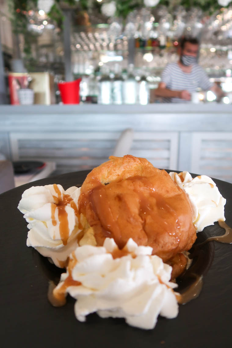 Avec cela, j’ai dégusté une grenadine (1,90 €). En dessert, j’ai opté pour une spécialité : le chou aux saveurs normandes (7,90€). Il s’agit d’un gros chou garni de pommes caramélisées, sauce caramel beurre salé, glace vanille et chantilly. Sympa !