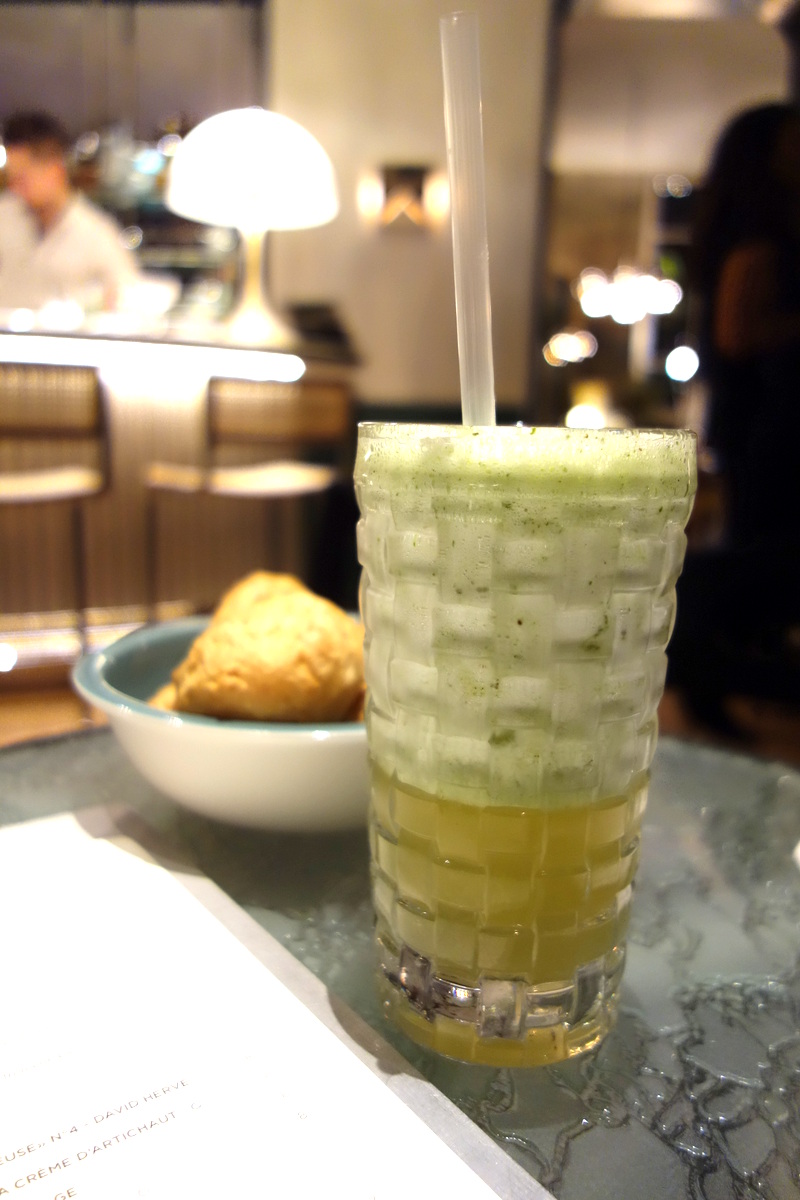 C’est le moment où je vous rassure : je suis allée quatre fois à ma salle de sport cette semaine là et ai bien marché plus de 10 000 pas par jour ! - une adaptation avec du kiwi du cocktail Troublemaker, initialement à la carotte, au gingembre, citron (8€). Un cocktail frais et plaisant.