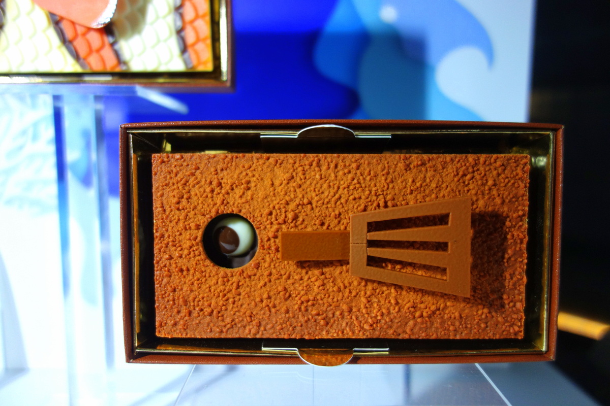 Un œuf géant de 6,6 kgs (1200€) est imaginé en édition (très) limitée. Il est fait de chocolat noir et de 34 petits poissons aux chocolats noir, lait et ivoire.