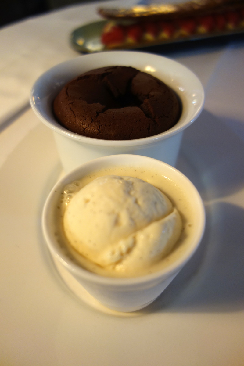 Pour terminer le repas, j’ai choisi la mousse soufflée au chocolat minute, glace vanille (14€). Elle est en réalité présentée sous la forme d’un fondant avec un tour cuit et un intérieur tiède et presque coulant. Une valeur sûre pour les amateurs de chocolat !