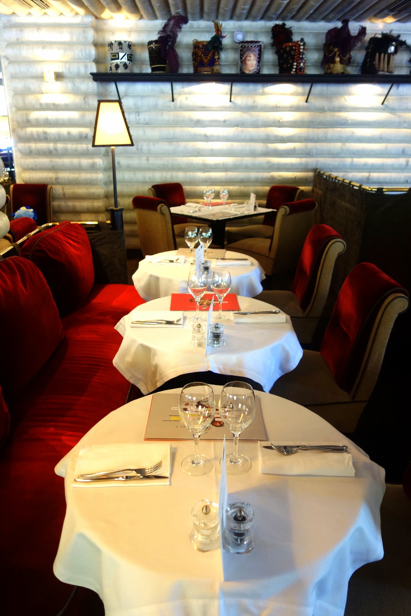 En passant la porte, on découvre un très beau restaurant au cadre de l’époque napoléonienne. Des sièges rouges et de chaque détail se dégagent une belle impression de confort et de chaleur. J’avais noté ces adjectifs et m’aperçois que le site du restaurant décrit les lieux de la même façon. C’est donc un objectif plus qu’atteint pour l’équipe !