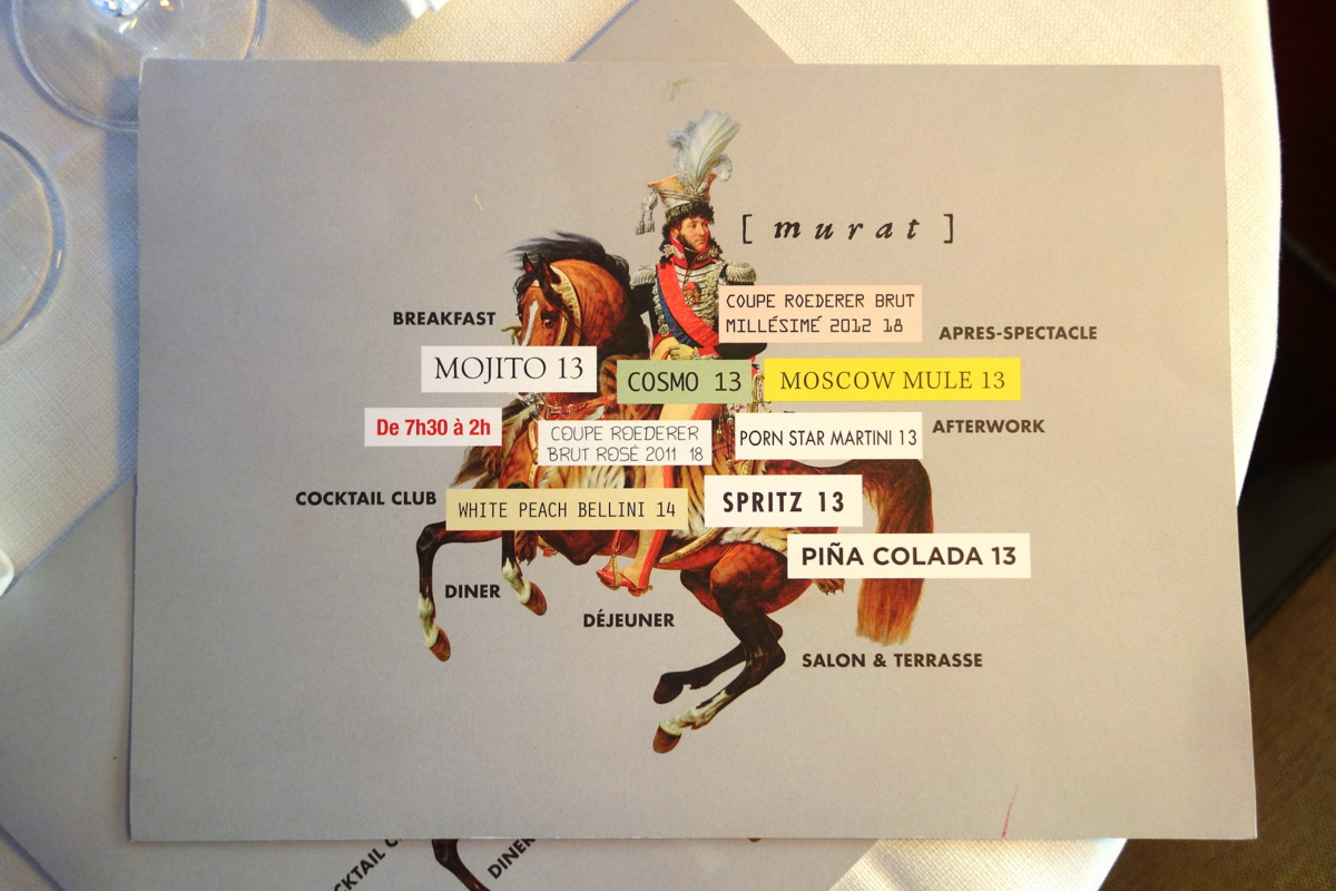 Le Murat, créé initialement en 2001 par Jean-Louis Costes, se prête aussi bien aux moments familiaux ou entre proches qu’aux échanges plus professionnels. Il est ouvert du petit-déjeuner à la fin de soirée.