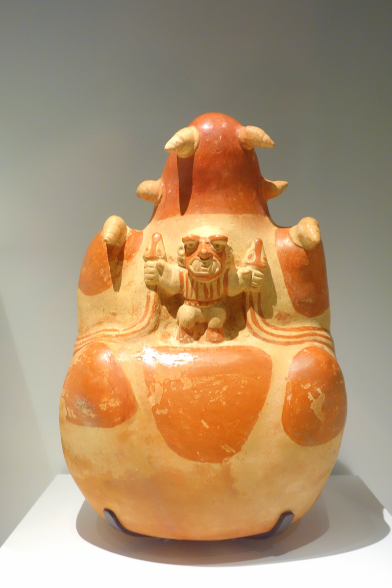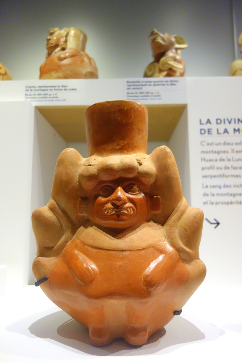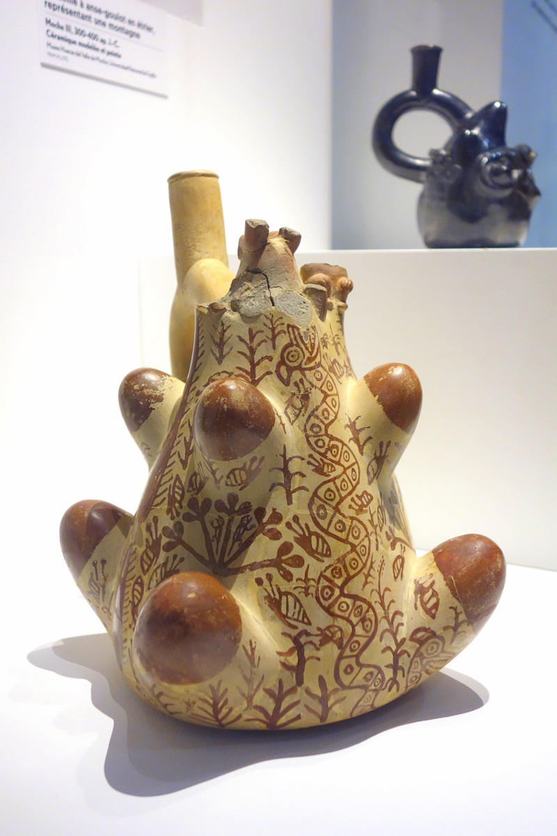 L’automne dernier, j’ai assisté à une visite privée de l’exposition « Le Pérou avant les Incas », qui se tient au musée du quai Branly jusqu’au 1er avril 2018. J’ai eu envie de la découvrir pour ma culture personnelle et par curiosité même si, vous le savez, je suis plus attirée par la peinture en matière d’art. J’ai quelques lacunes à combler en histoire (comme nous tous, rassurez-moi ?) et écouter le commissaire de l’exposition – décédé depuis (…) – ne pouvait être qu’instructif. Les connaissances ont beaucoup évolué depuis le temps où il était étudiant. Avant les Incas, le Pérou a connu les cultures cupisnique, mochica, chimú, etc. Céramiques, ornements en cuivre, en or et en argent ont été découverts. L’on pourrait dire que le passé continue à s’écrire. C’est en toute modestie que je reviens sur cette visite, narrant une histoire que je connais si peu !