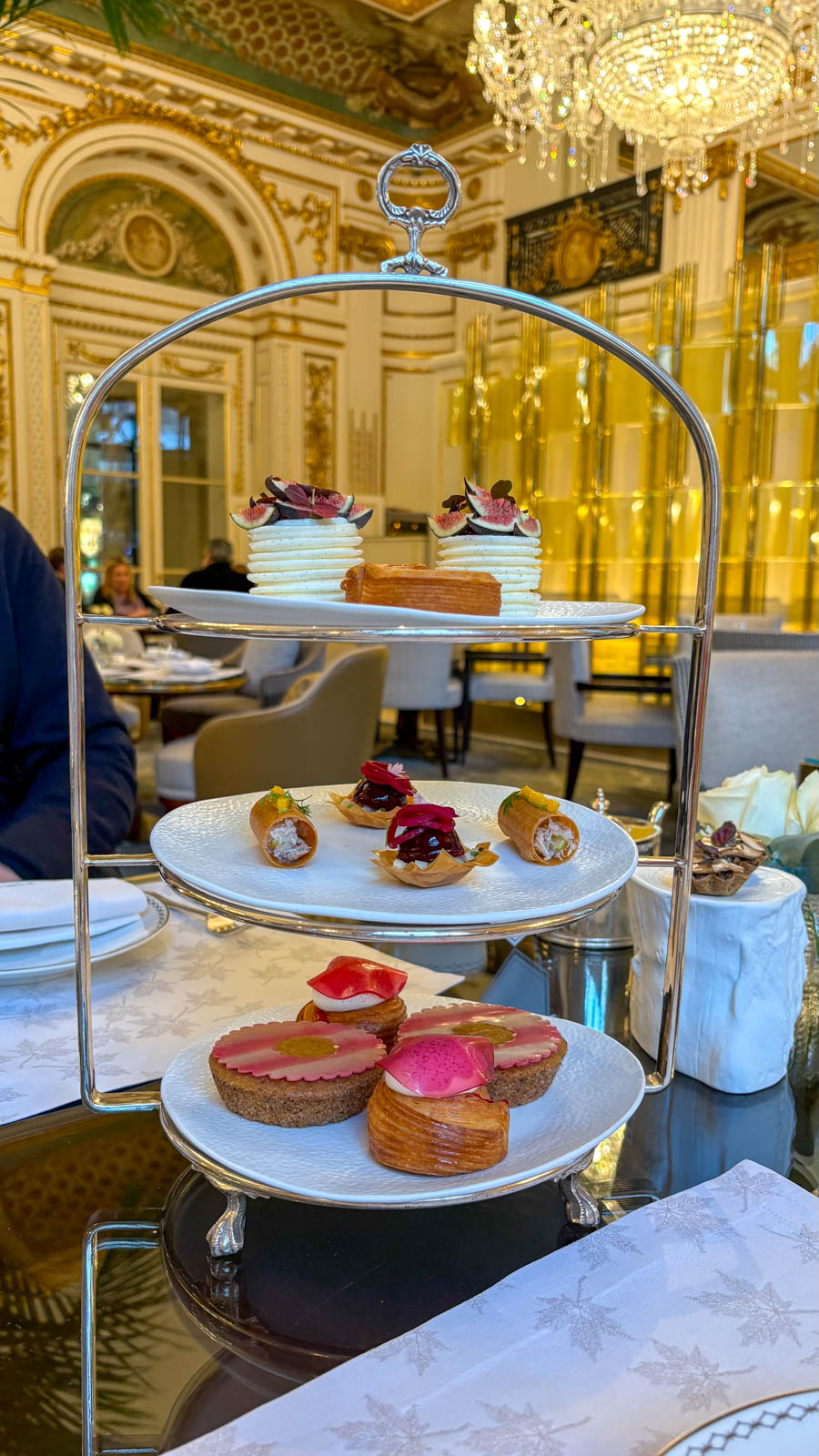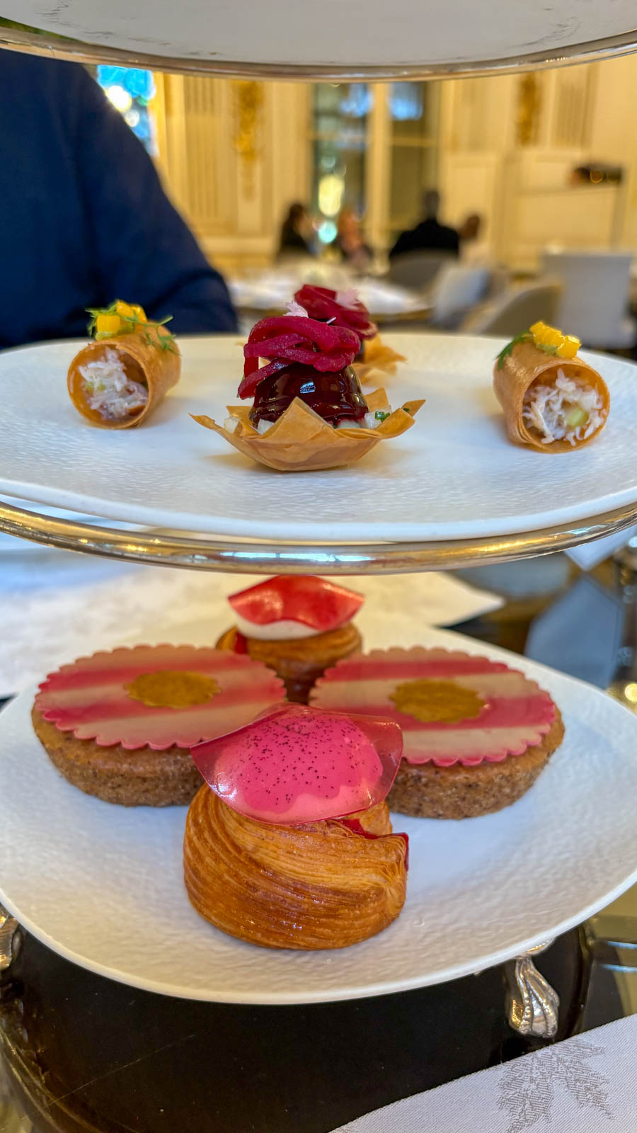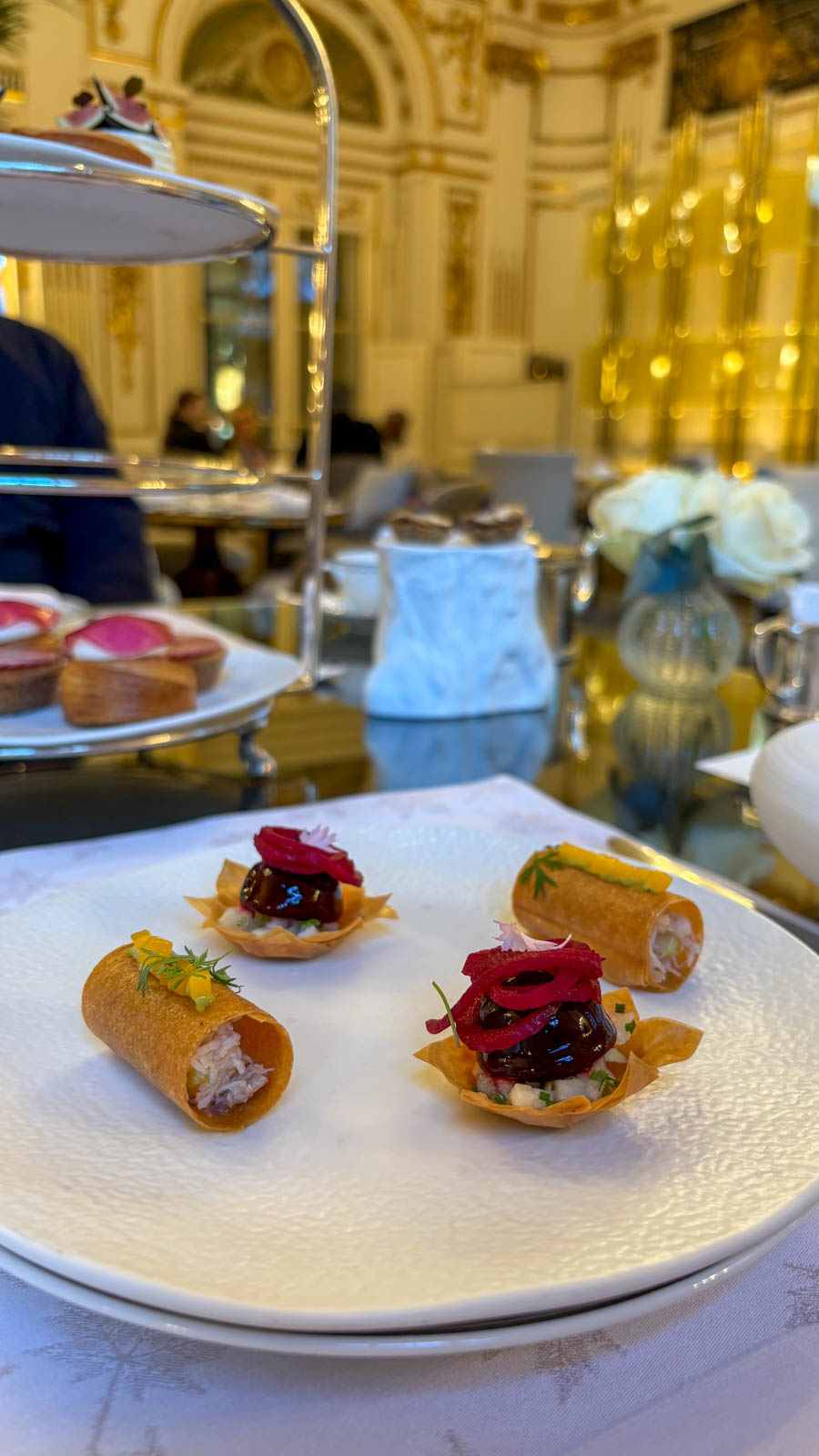J’ai, en règle générale, un goût vraiment affirmé pour les desserts au chocolat et aime en trouver quelques touches lors d’un tea time. Mais je constate aussi que les chefs pâtissiers des palaces n’aiment pas tomber dans ce qui paraît peut-être être une facilité. Au final, tout était vraiment très bon, raffiné, parfaitement travaillé. Nous avons suivi avec enthousiasme la suggestion d’ordre dans lequel déguster les canapés et les pâtisseries. Aimant beaucoup le salé, nous avons apprécié qu’il s’agisse d’un tea time salé et sucré.
