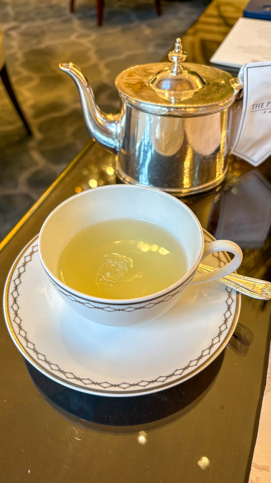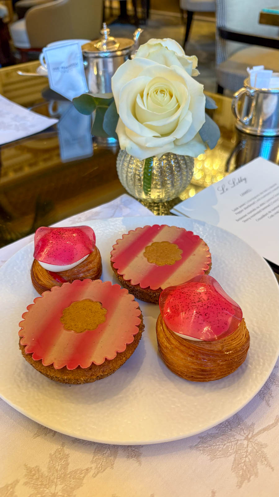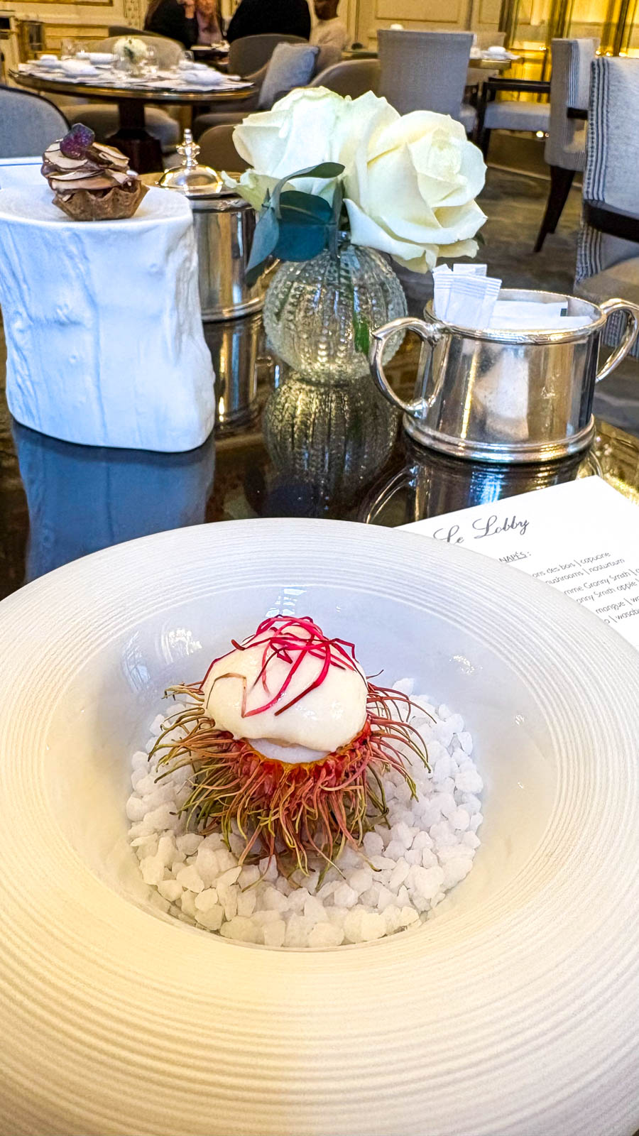 J’ai, en règle générale, un goût vraiment affirmé pour les desserts au chocolat et aime en trouver quelques touches lors d’un tea time. Mais je constate aussi que les chefs pâtissiers des palaces n’aiment pas tomber dans ce qui paraît peut-être être une facilité. Au final, tout était vraiment très bon, raffiné, parfaitement travaillé. Nous avons suivi avec enthousiasme la suggestion d’ordre dans lequel déguster les canapés et les pâtisseries. Aimant beaucoup le salé, nous avons apprécié qu’il s’agisse d’un tea time salé et sucré.
