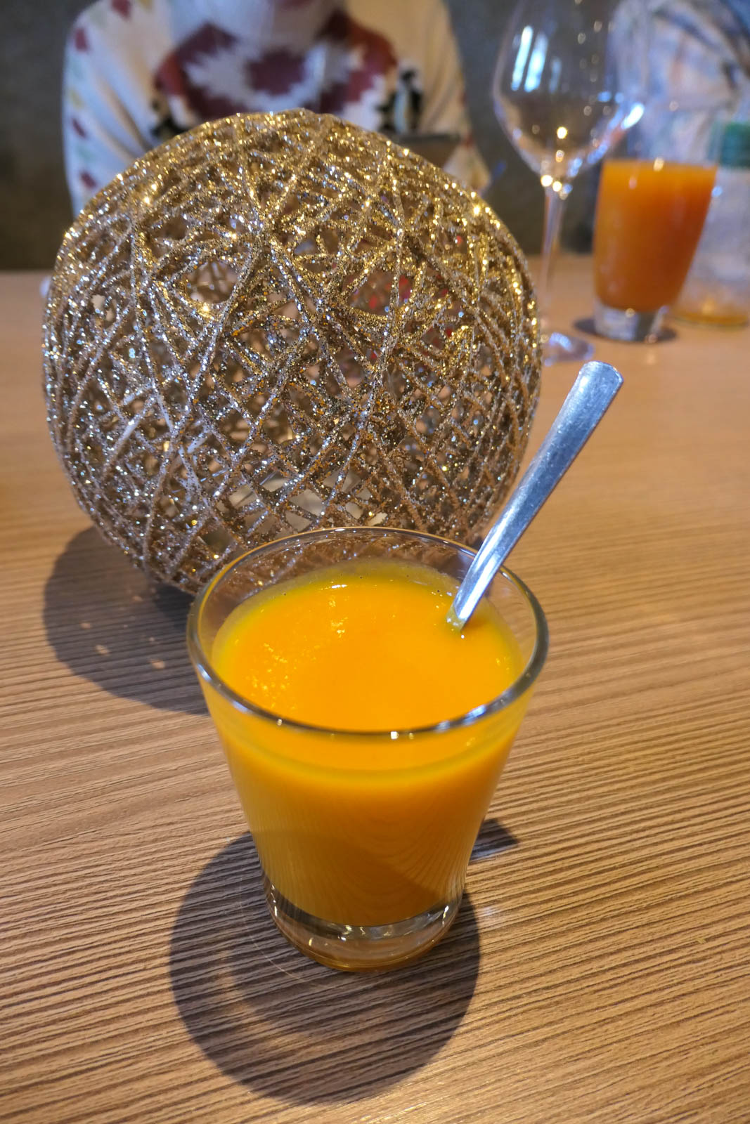 Une exemple d’entrée : velouté de potimarron, pleurotes fumés et foie gras poêlé