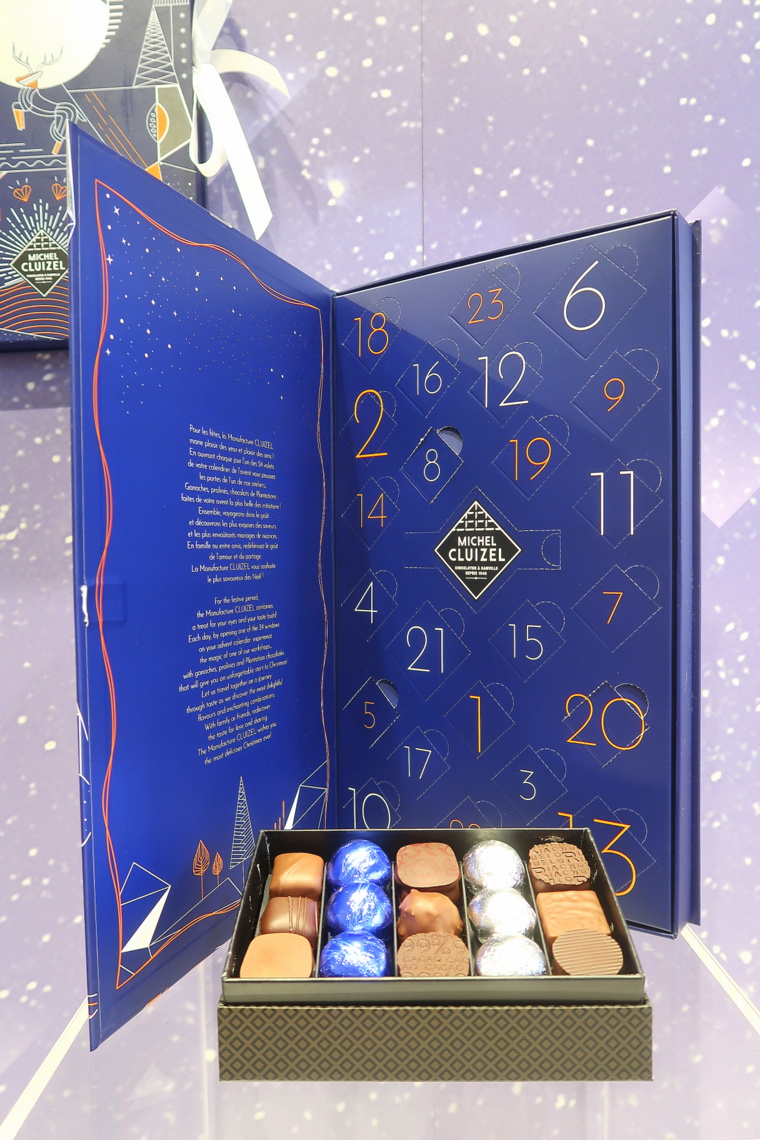 - un calendrier de l’Avent (39,90€) – disponible depuis octobre – conçu comme un livre, renfermant 24 bouchées prometteuses : Gianduja vanille, mendiant, petite barre, etc.