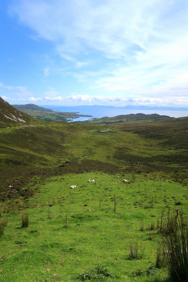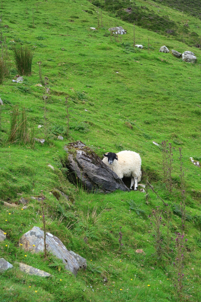 Au départ de Killybegs, nous avons emprunté la route côtière qui longe l’Atlantique en direction de l’Ouest, en faisant de très beaux arrêts. Au programme : peu de place pour rouler (il faut partout en Irlande mémoriser les endroits jusqu’auxquels reculer), des moutons, pâturages, pierres, roches et fleurs. La vue sur Cionn Mhucrois est particulièrement sublime.