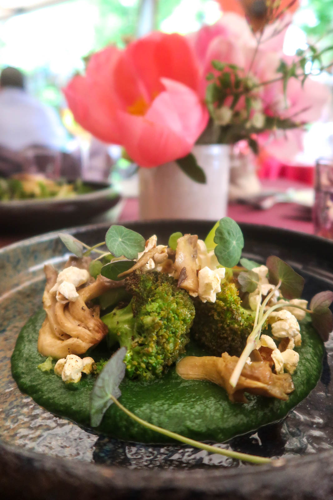 • brocolis et pleurotes rôtis, crémeux Alla verde (aux notes d’épinard), pop corn au tandoori