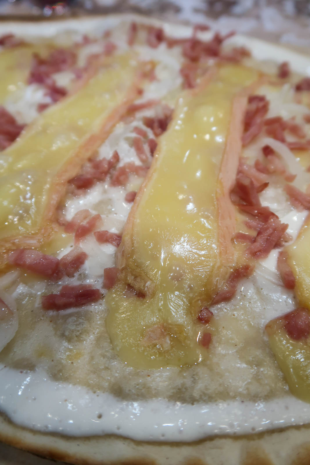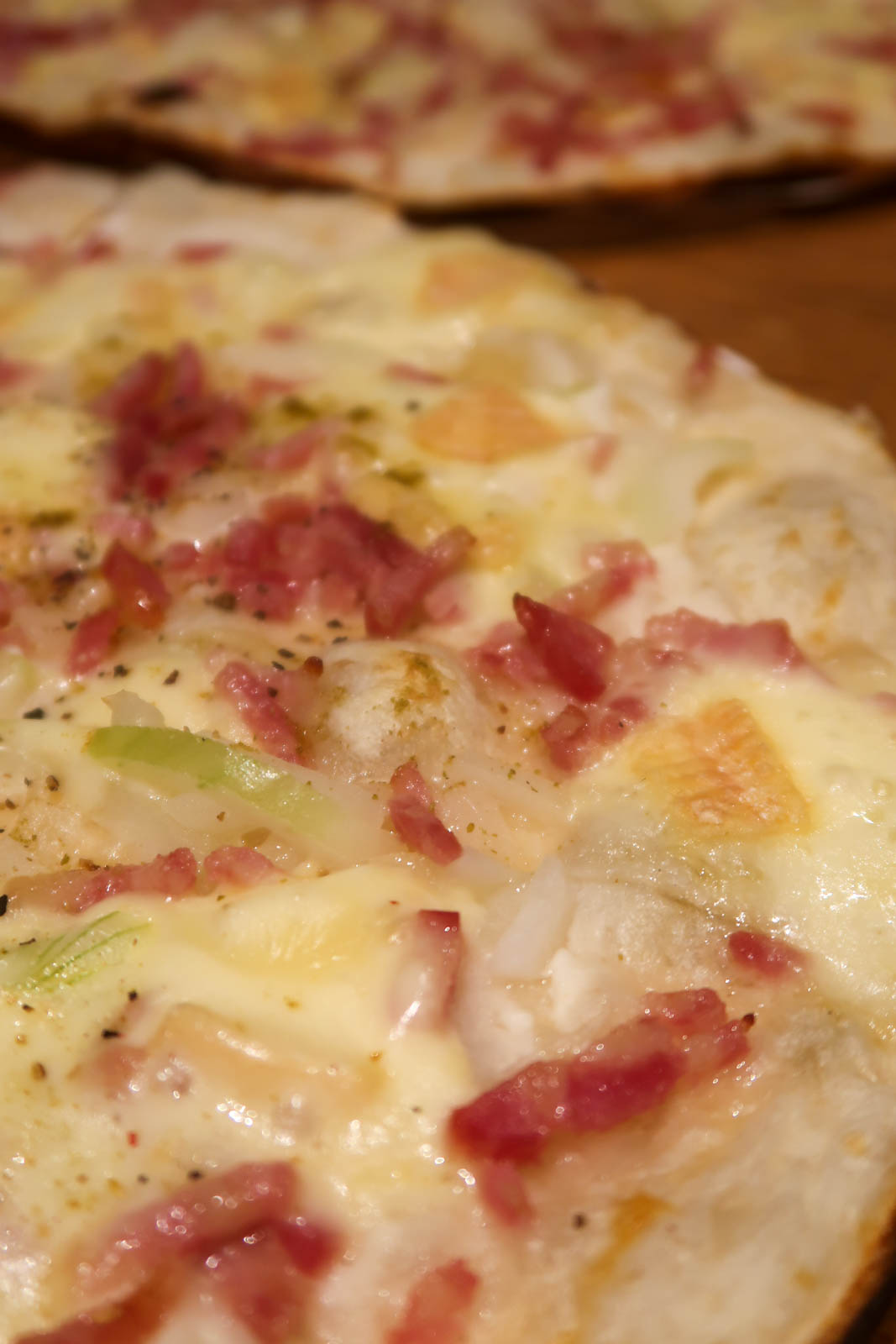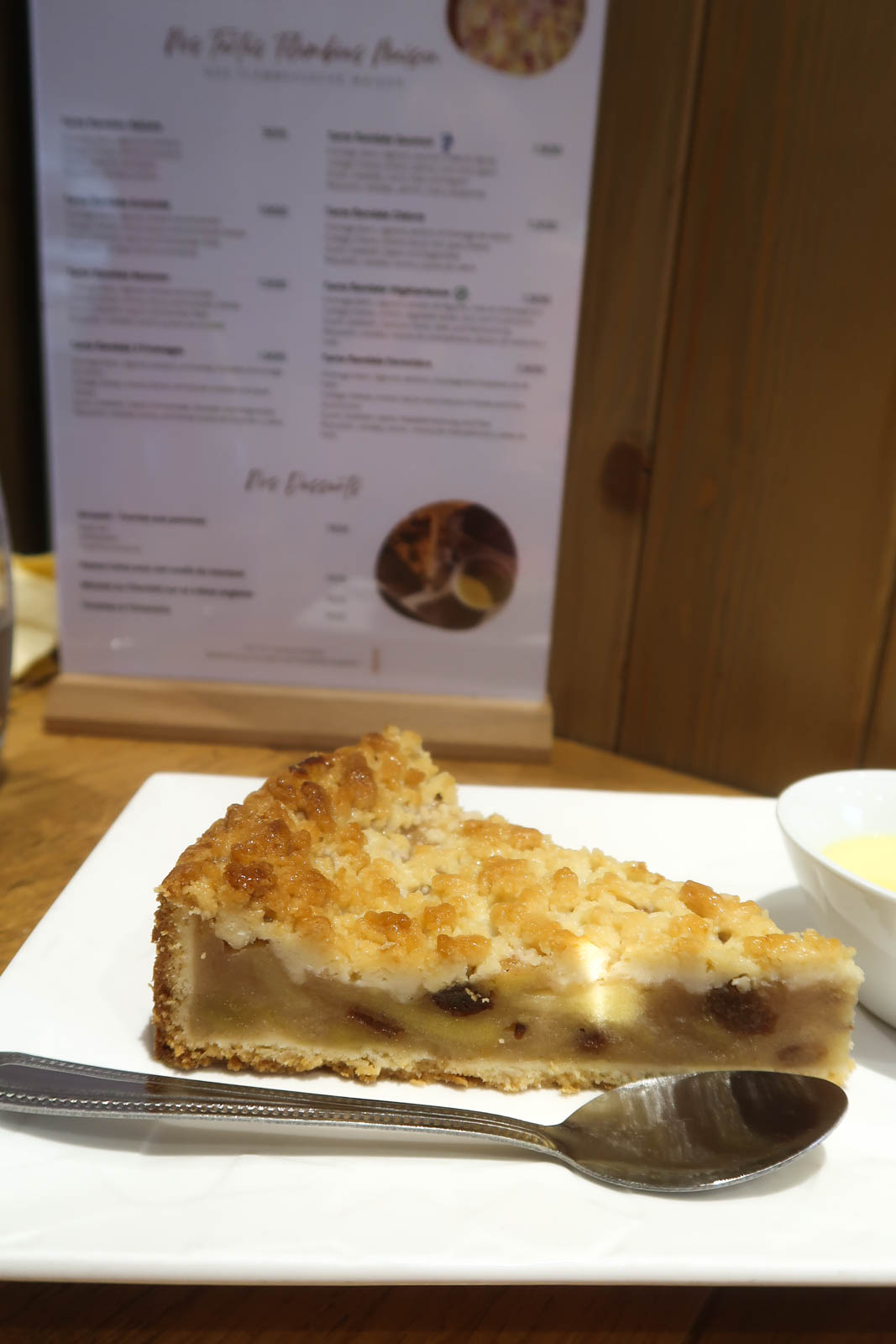 Monsieur et moi avons chacun mangé une tarte flambée avec du munster, à base de fromage blanc, oignons, lardons et munster (12,80€). J’ai fini avec un Strussel, décrit sur la carte comme une tourte aux pommes (7€). L’ensemble était bien agréable.