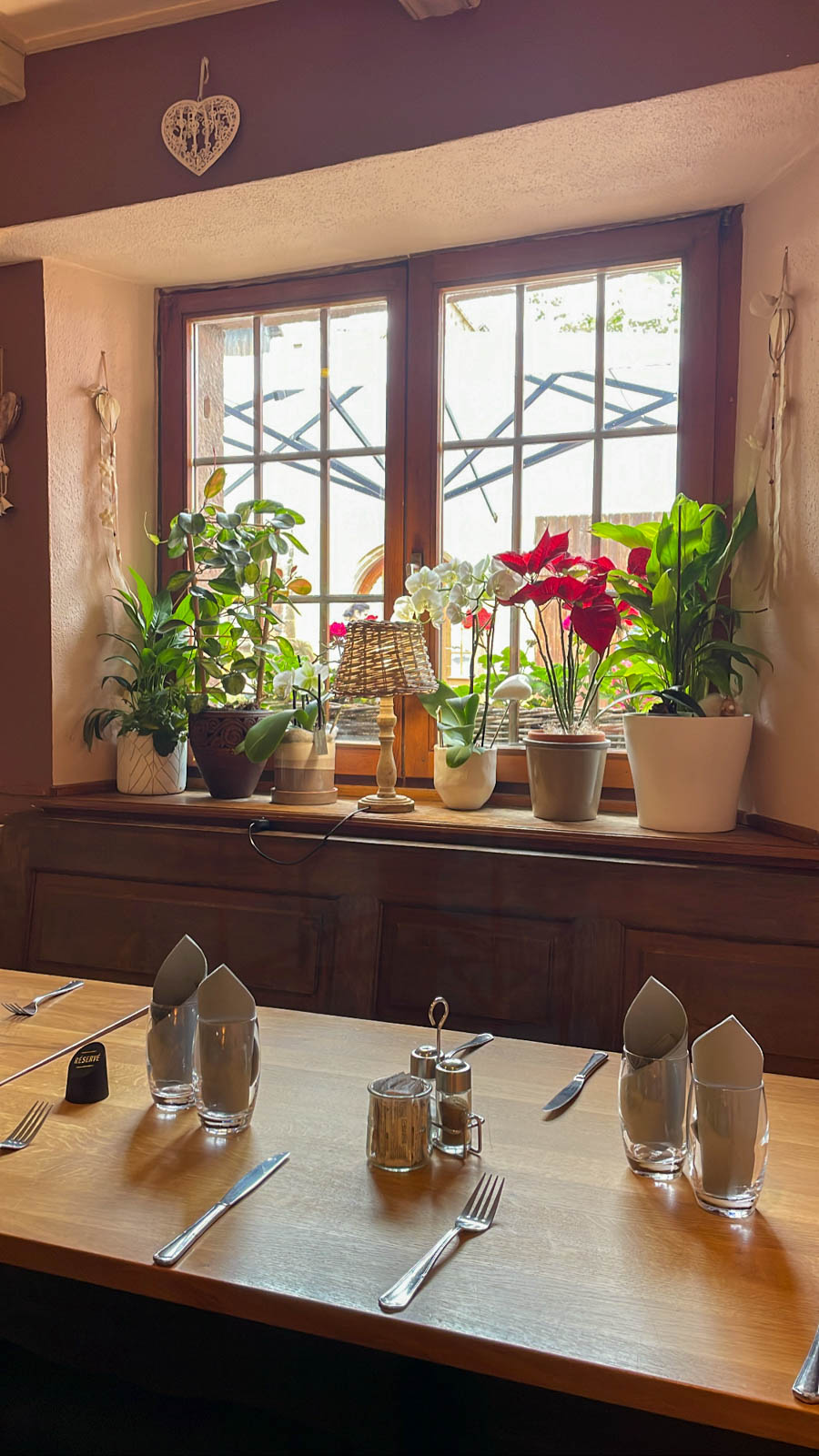 Sur place, nous avons déjeuné au restaurant Au château fleuri, choisi à la fois parce que nous avons senti l’appel de la tarte flambée mais aussi en fonction de l’endroit où nous étions à l’heure du biberon et de notre configuration familiale : le service rapide et l’accueil gentil et simple se prêtent très bien à un repas avec un bébé. Chaise haute et table à langer étaient à disposition. Le lieu est décoré de bois clair avec des coucous suisses (à vendre) aux murs. Sympa !