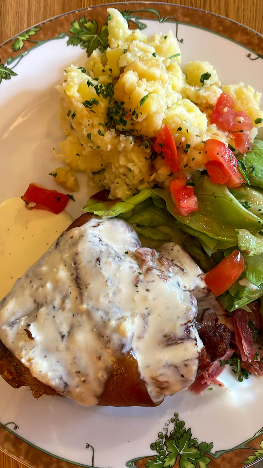J’ai choisi de déguster un gratin de spaetzle au munster accompagné de salade verte et de jambon de la forêt noire (18,40€). J’ai beaucoup aimé le gratin, très gourmand, et le fait qu’il soit servi avec de la salade. Mon estomac étant un peu sensible quand il s’agit de jambon fumé, j’ai donné cette partie de mon plat à Monsieur mais étais déjà très bien nourrie sans cela ! Lui a opté pour le jarret de porc grillé sauce au munster (19,20 €), une suggestion du jour.