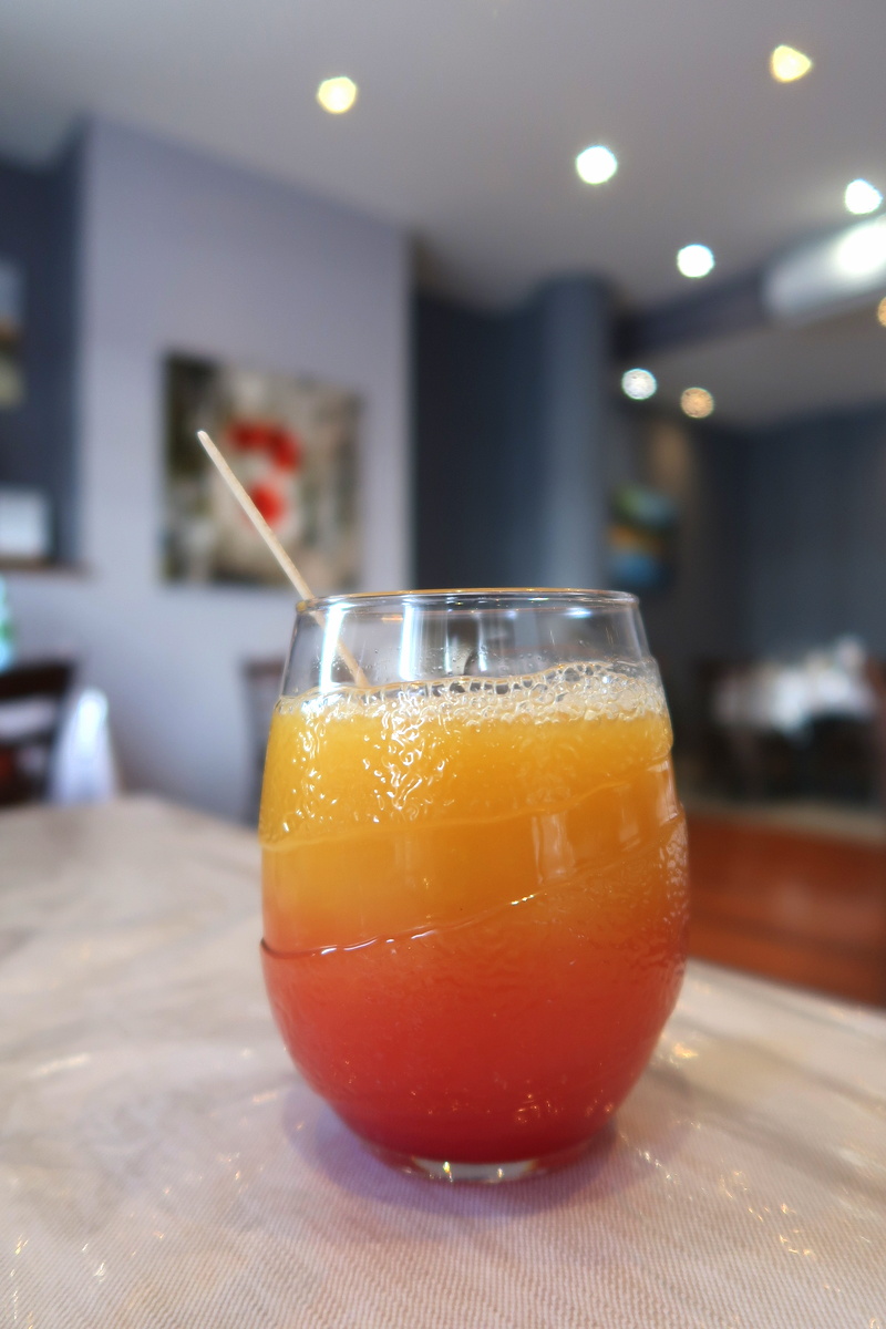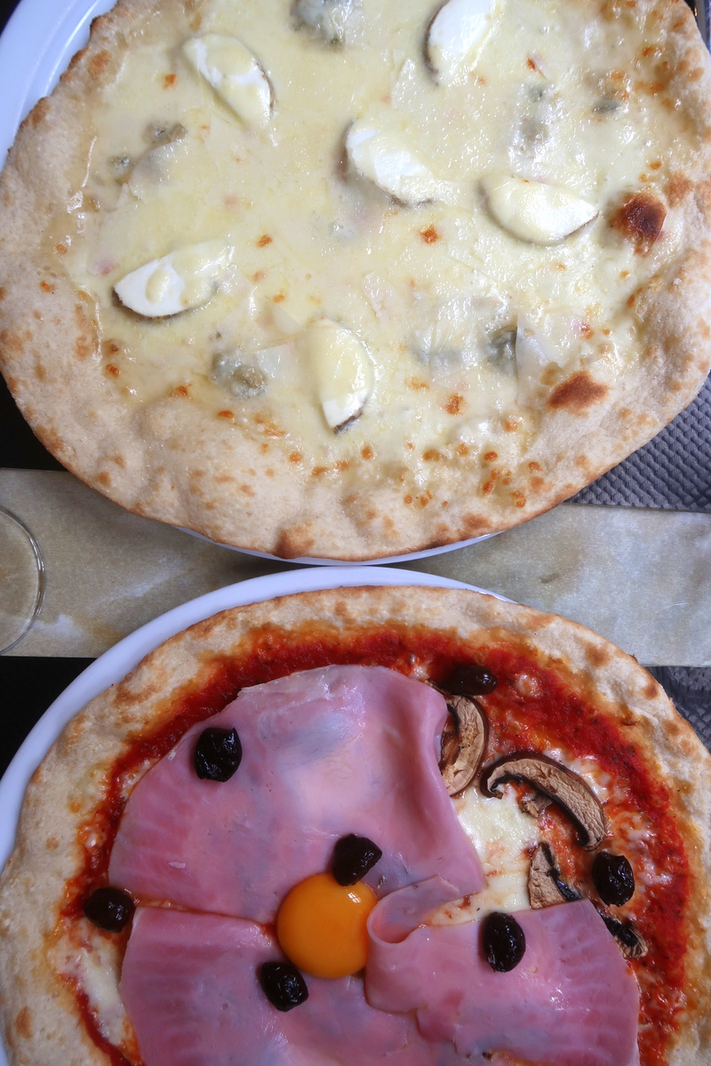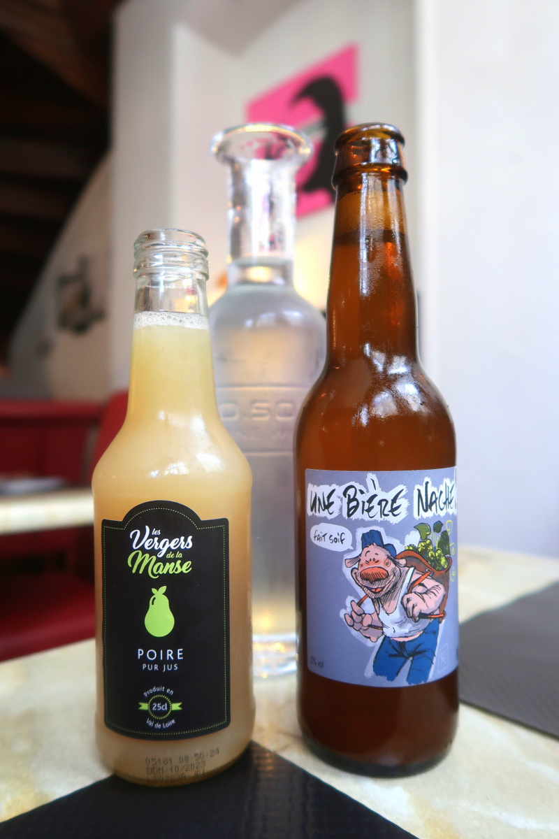 Nous avons donc déjeuné dans un restaurant qui semblait tout de même recueillir de bons avis et avait le mérite d’être ouvert et d’avoir de la place : le Bistrot latin. Nous y avons commandé chacun une pizza : une Regina avec supplément œuf pour moi (13,70€) et une quatre fromages – mozzarella, gorgonzola, chèvre paysan et parmesan – pour Monsieur (15€). J’ai accompagné mon repas d’un jus de poire Vergers de la Manse « made in Touraine » (3,70€).
