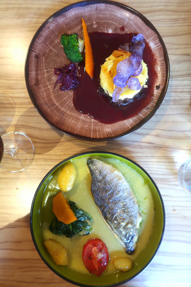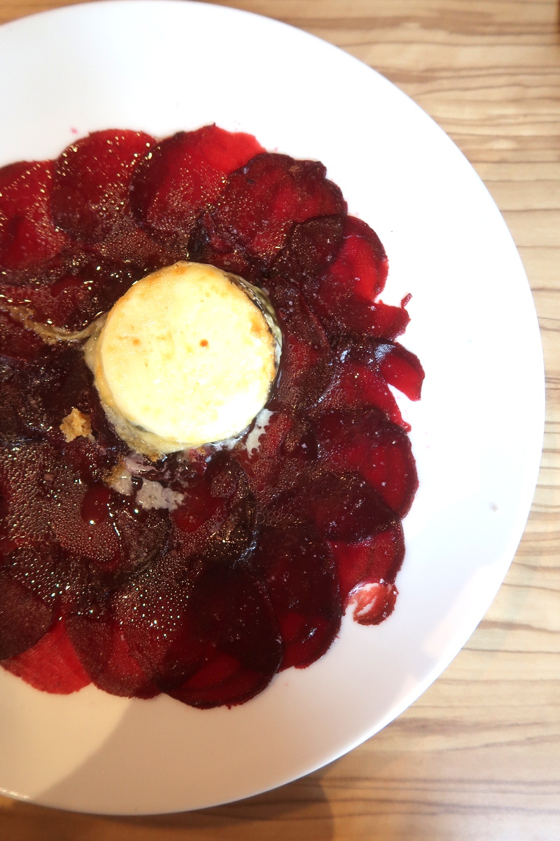 Enceinte, j’avais une fois encore moins de possibilités (mais je l’ai bien vécu, hein) : bye bye le tartare de saumon à l’huile d’olive citronnée ou la salade de lentilles au foie gras. Je n’ai donc pas pris d’entrée tandis que Monsieur a choisi le carpaccio de betteraves, fromage de chèvre rôti et vinaigrette cassis-framboise.