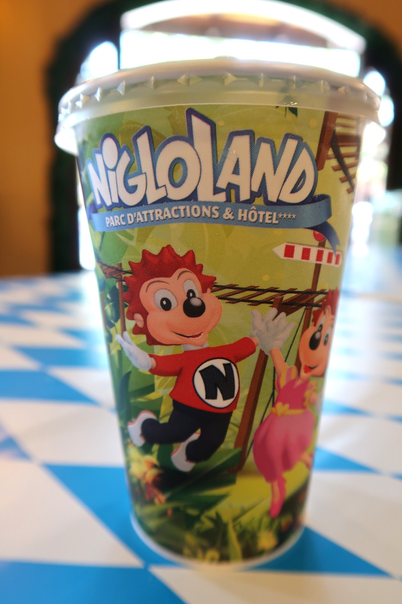 Ces dernières années, lorsque nous allons au parc, nous nous arrêtons à la Taverne. Je n’ai jamais très envie de frites, jambon ou saucisse au mois d’août mais trouve généralement mon bonheur avec une salade composée, une faisselle et un dessert au chocolat ou une tartelette aux framboises. Pour la 1re fois, j’ai goûté un bretzel au fromage, qui m’a fait plaisir. Les gobelets Nigloland nous ont beaucoup plu. Pour moi, c’était ice tea au menu. Pour vous donner un ordre d’idée, nous avons payé environ 95€ pour cinq déjeuners.