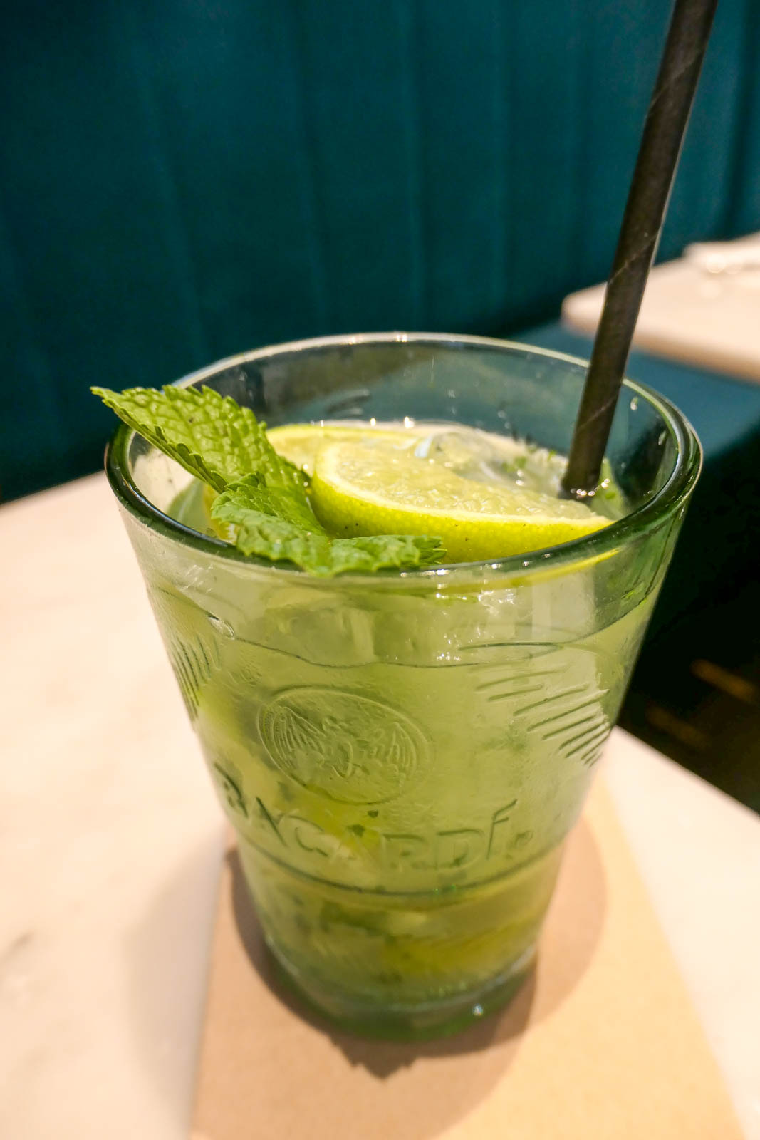 Monsieur a dégusté un Perlamatta Spritz (9€), composé de Martini Fiero 4cl, Prosecco 6cl, eau Gazeuse 6cl et orange. Il a trouvé son cocktail frais et délicat. Pour ma part, j’ai choisi le virgin mojito (6,50€), qui était frais, agréable et bien citronné.