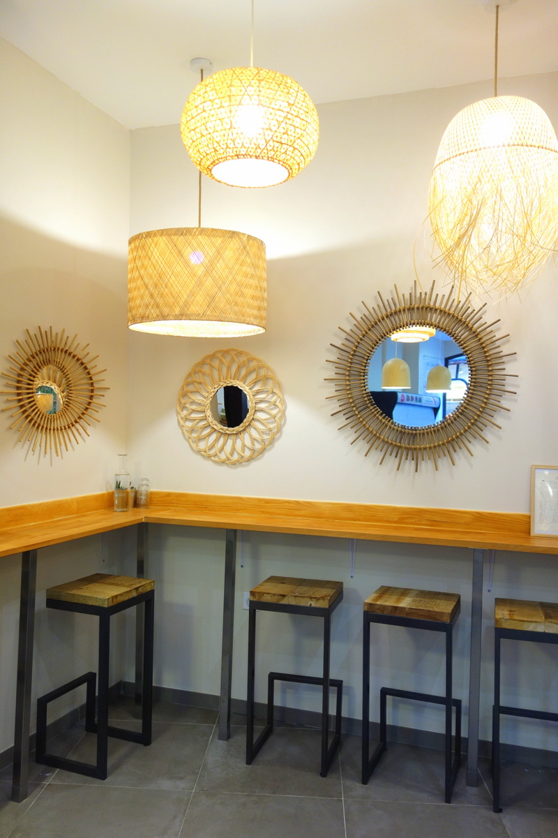 Il est possible d’emmener son Poké bowl ou de le déguster sur place, à proximité du comptoir ou, en passant devant la cuisine, en bas.