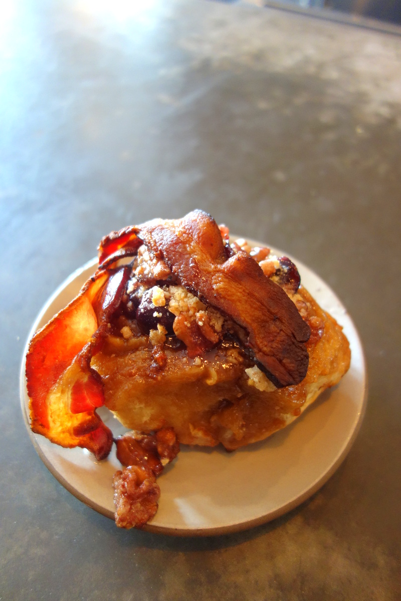 J’ai choisi un « avocado smash » (8$ hors taxes et pourboire) : de l’avocat, du poivre noir, un œuf bouilli, de l’échalote, du cornichon, du jalapeno sur un pain au levain maison. C’était très bon mais super épicé. J’avais les lèvres et la bouche en feu ! Mes yeux n’avait pas bien dû voir la mention de « jalapeno ».